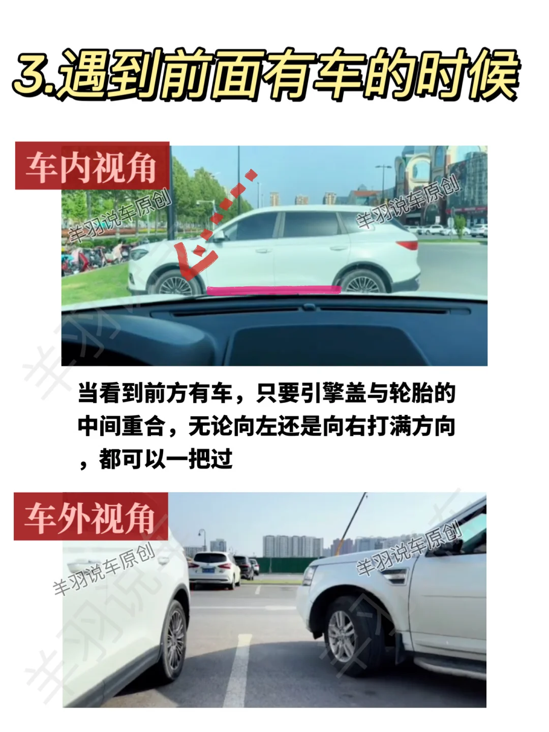 3⃣️前方有横向车辆时,只要引擎盖与轮胎的一半重合时,此时无论向左还是向右打满方向都能一把过。