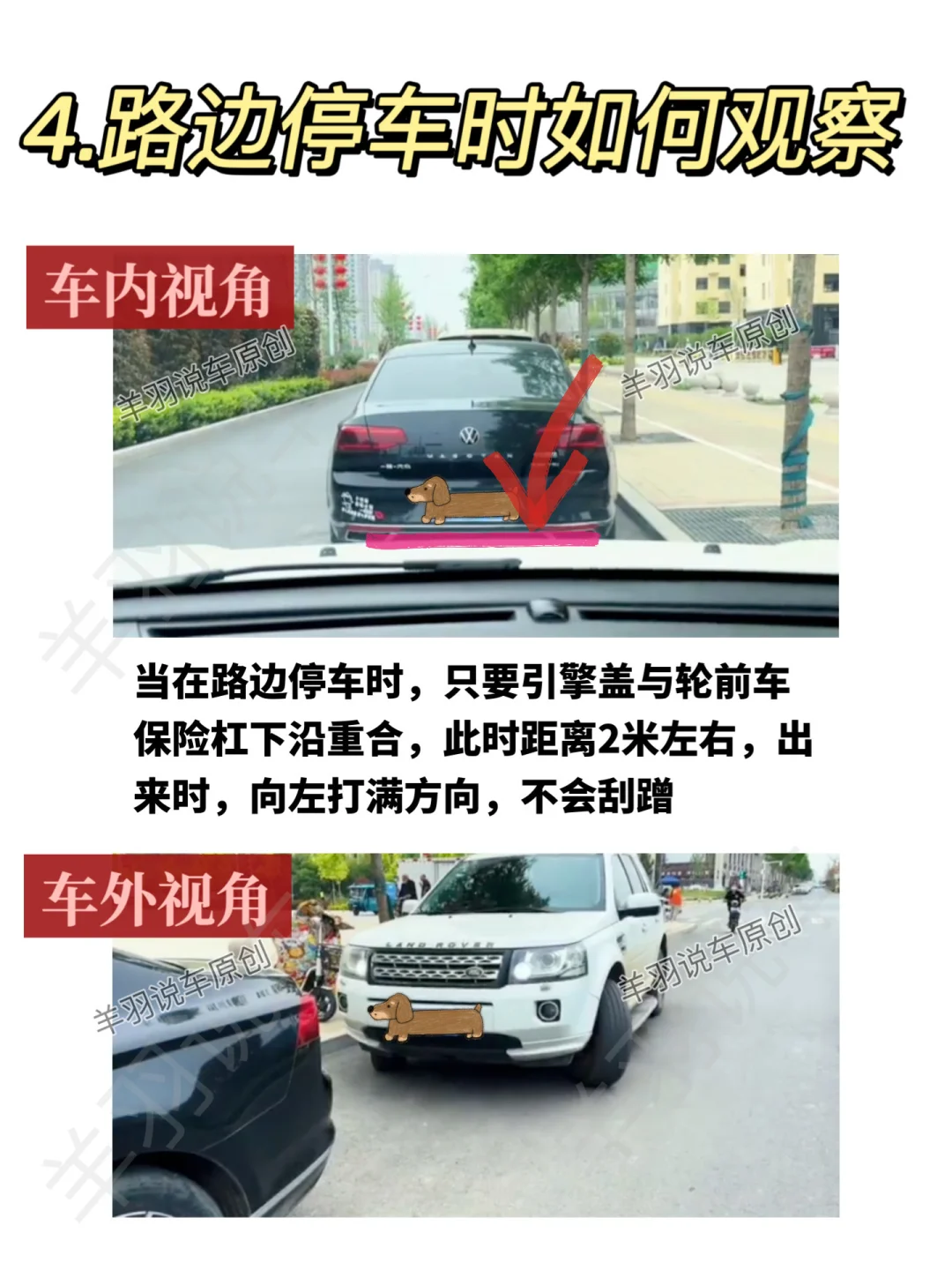 4⃣️路边停车时,只要引擎盖与前方车尾下边沿重合时,此时向左打满方向,可以一把开出来