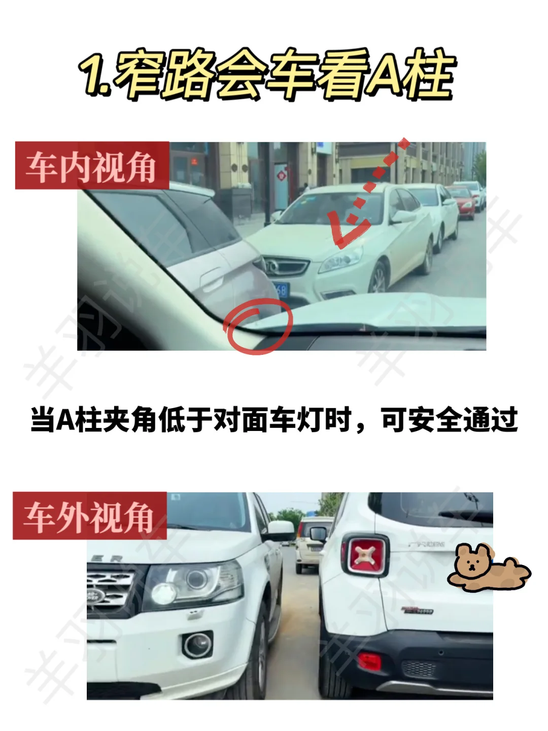 1⃣️窄路会车时,主要盯住A柱夹角,当A柱夹角低于对面车灯时,可以安全通过