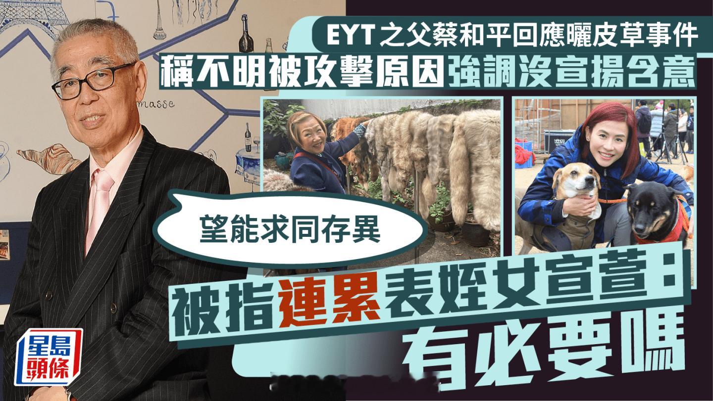 星岛:EYT之父蔡和平回应晒皮草事件:希望能求同存异 被指连累表侄女宣萱发文反问“有必要吗”《欢乐今宵》之父、电视制作人蔡和平日前在IG分享晾晒皮草的照片,数十条可看到动物完整头部及爪的皮草挂于花园位置,举动引起争议。蔡和平日前就此在facebook作出回应,亦有提及表侄女宣萱。蔡和平:我很抱歉据蔡和平日前分享,这些皮草珍藏属于前电视台高层太太任平平。帖文中包含任平平笑容满面与皮草留影的照片,引来爱护动物及反皮草的网民留言批评,更有网民将蔡和平夫妇的行为,拿来跟他们的表侄女宣萱对比,直指双方在爱护动物的行为上看来南辕北辙。蔡和平就争议日前在facebook作出回应,亦有提及表侄女宣萱,“有必要让我的(表)侄女Jessica Hsuan(宣萱)因为与她无关的事情而难堪吗?”蔡和平亦就争议道歉:“我很抱歉,我之前分享了我妻子皮草的照片,这让一些朋友感到不快。”蔡和平是爱动物之人蔡和平续指:“我非常欣赏大家对动物福利的热情和关注,这真的让我感同身受。我想澄清一下,我分享的皮草都是旧皮草,也就是说,它们来自皮草曾经是时尚界常见元素的年代,那时我对皮草相关的问题还没有那么了解。身为动物爱好者,我反对任何为了获取皮草而伤害动物的现代做法,尤其是一些不必要的做法。我的本意并非提倡使用皮草,而是想反思我们的过去以及不断变化的时尚标准。我希望我们能在这个问题上求同存异,但仍然在对动物的爱中找到共同点。我希望能够互相理解,并鼓励大家继续对话,探讨如何共同支持动物权。”此外,他亦表示不明为何而受到攻击,他昨日(8日)再于facebook回应:“我不知道为什么我分享了我妻子收藏皮草的故事会遭到攻击?我并没有宣传或鼓励购买皮草。为什么我们不能在意见不一致的事情上求同存异,这样世界才会更美好呢?”