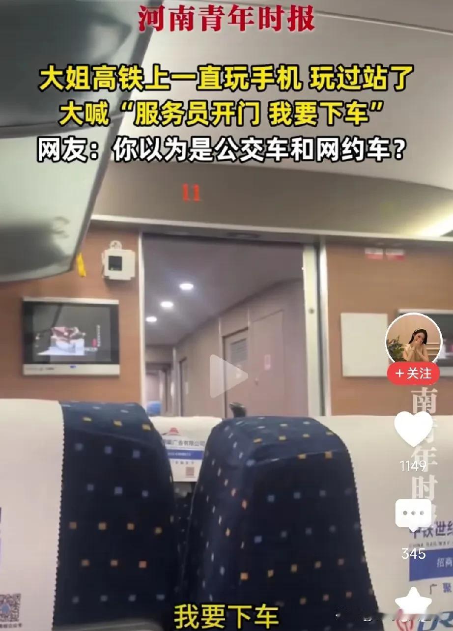 一大妈坐高铁只顾着刷手机,结果坐错了站。他以为这是公交车,直接在高铁上大喊大叫,快开门,我要下车。坐过站啦,开门呀,我要下车。 大妈平时一看都不省事儿,这不是公交车上,这是高铁,不是说你说停就停的,现在给你开门,你敢下吗?你自己耍手机坐过了站,你怪谁呀?你只能怪你自己,吃一堑长一智。