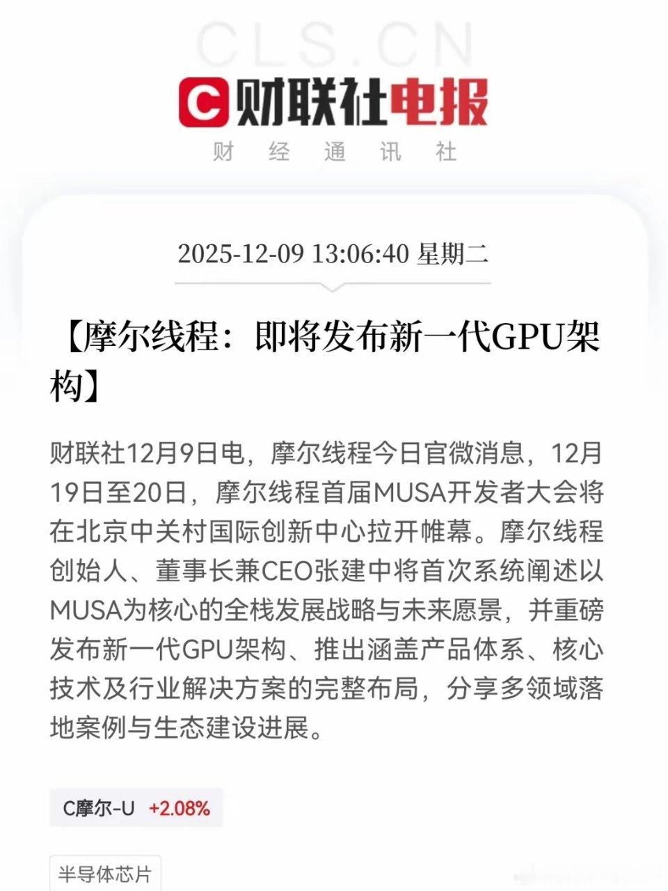 摩尔线程又有大动作这段时间科技成长股的利好消息是真的多,AI产业链又来利好了!摩尔线程宣布将于12月19日至20日举办首届MUSA开发者大会,届时将正式发布新一代GPU架构。新架构基于自研MUSA统一系统架构,强调在单芯片上同时支持AI计算、图形渲染、物理仿真等多种功能,区别于专注于单一领域的芯片。新一代GPU在并行计算效率、能效比等核心指标上实现显著提升,支持多精度计算,特别针对大语言模型推理场景优化了张量核心设计。通过发布Torch-MUSAv2.0版本,实现了PyTorch2.5的完整支持,开发者可轻松将现有PyTorch模型迁移到MUSA架构,大幅降低迁移成本。简单来说,就是性能有着明显提升,适用场景有着扩大,且迁移成本很低。属于利好消息!点赞,就是对我最大的支持!