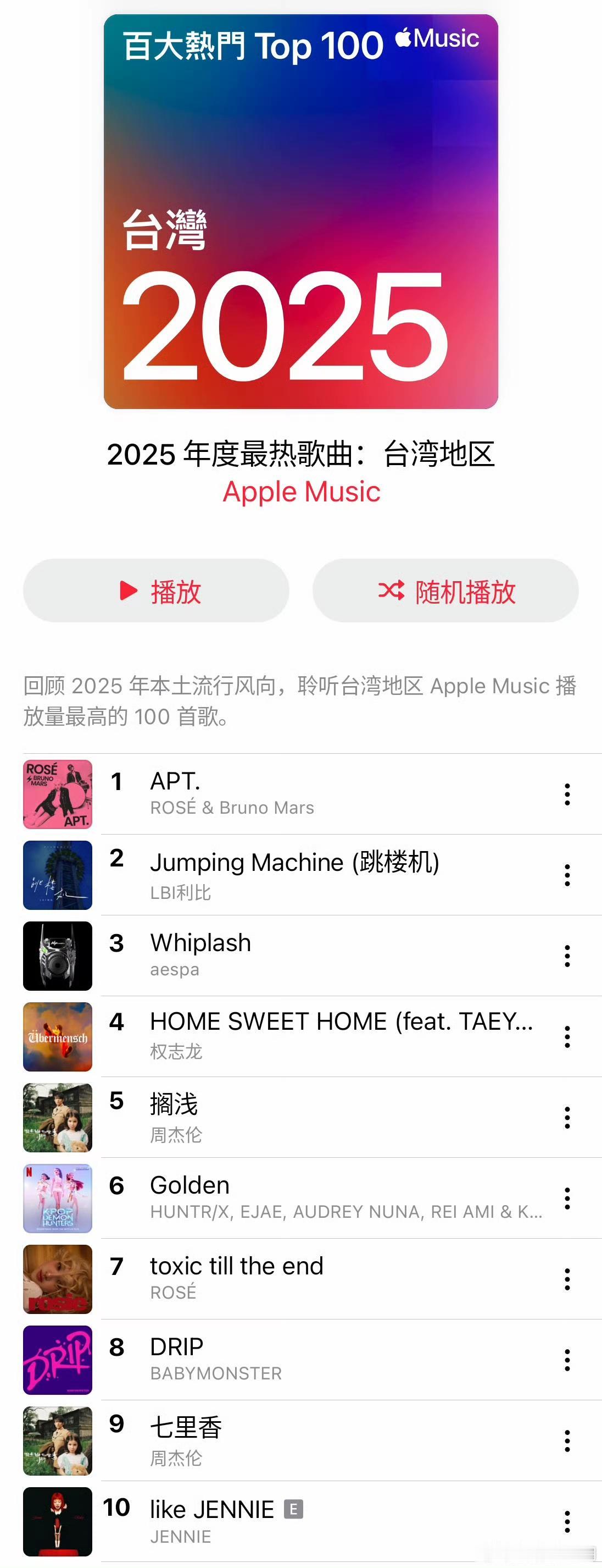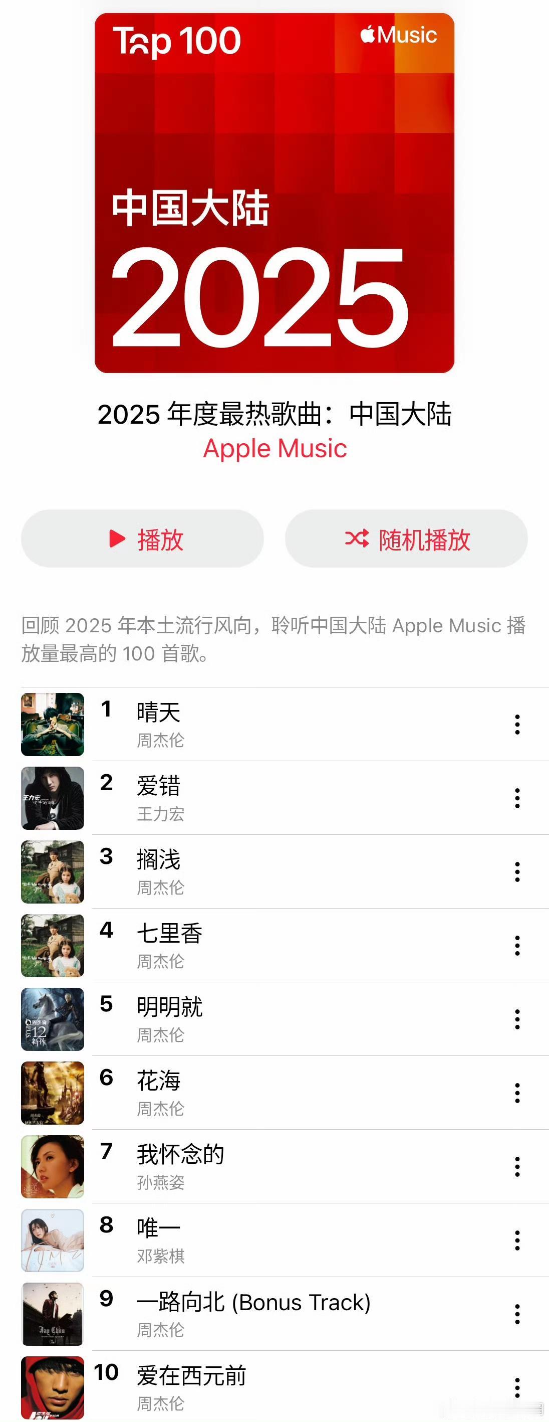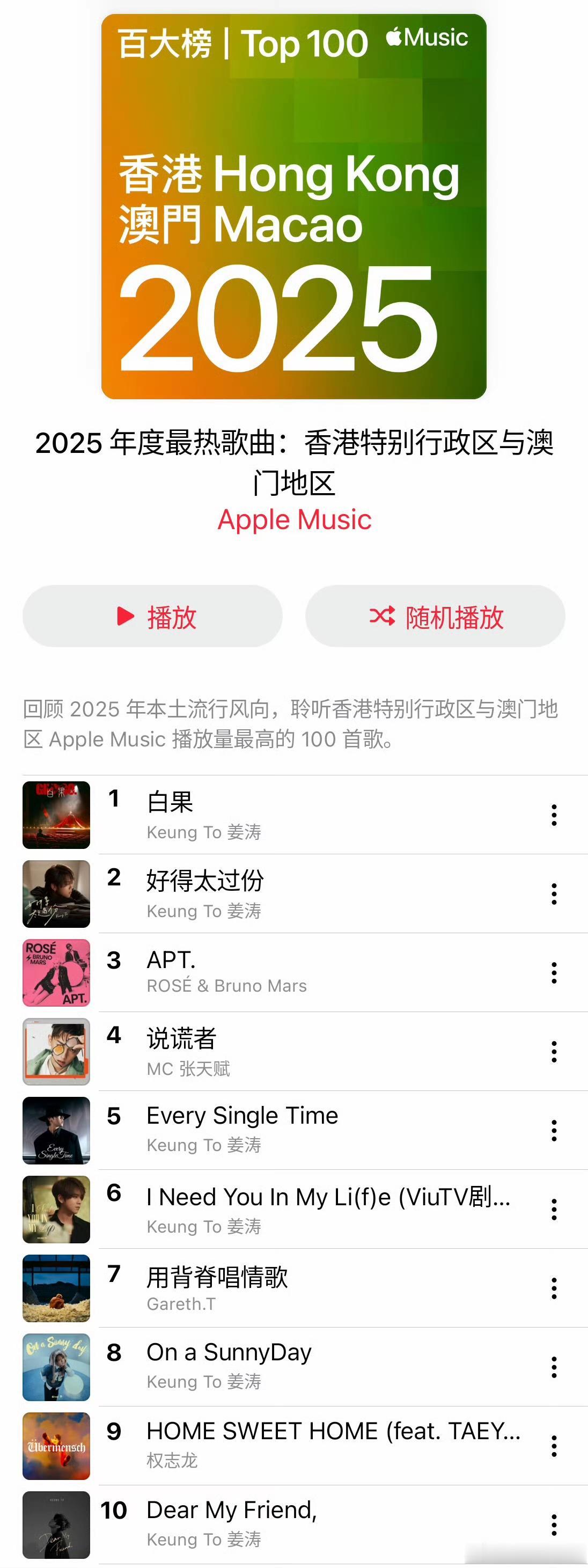 近日,苹果音乐发布了2025年度最热歌曲。周杰伦的《晴天》霸主内地榜首,港澳地区最喜欢听姜涛的《白果》,而台湾地区最喜欢听朴彩英与布鲁诺·马尔斯的APT。一看这榜单,我非常怀疑这是不是流行歌曲榜单。这三首歌曲只有姜涛的《白果》是2025年发布的,周杰伦的《晴天》是2003年上市的,而APT是2024年发表的。后来再一看是苹果音乐年度歌曲,秒懂!