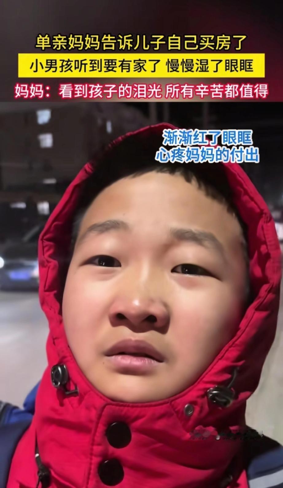 一位单亲妈妈 跟自己的儿子说“妈妈买房子了” 儿子刚开始是一脸的不可置信 等听妈妈再说的时候 眼角慢慢的变红了,眼睛也湿润了,抱着妈妈哭了起来 儿子可能是心疼妈妈这么多年的辛苦 也可能是因为自己和妈妈终于有自己的家了,有了谁也赶不走自己的家,而感到高兴吧 这个妈妈真的很伟大,一人抚养孩子还买了一个房子 祝福他们,也替他们感到高兴[送自己一朵花][送自己一朵花]