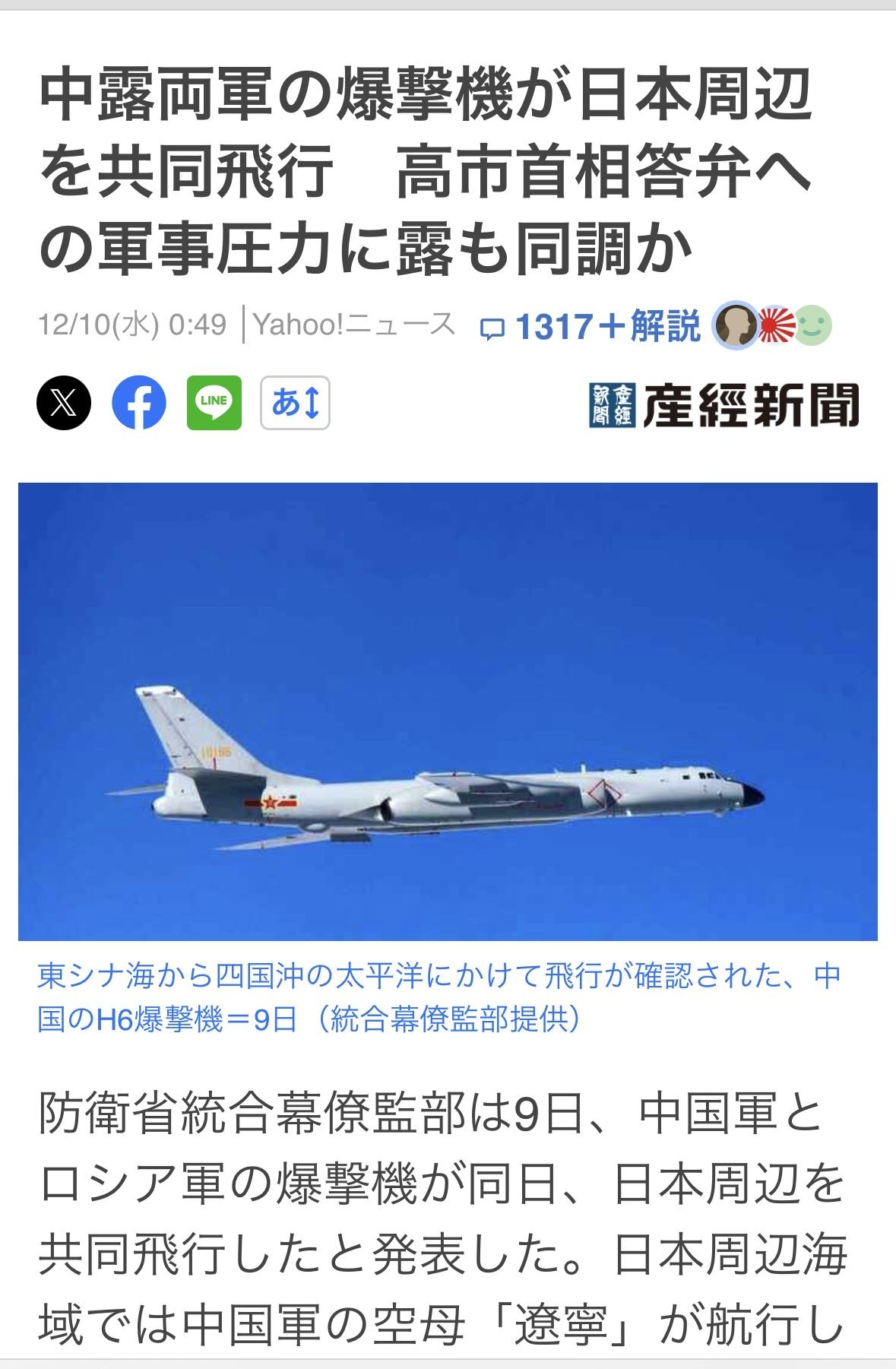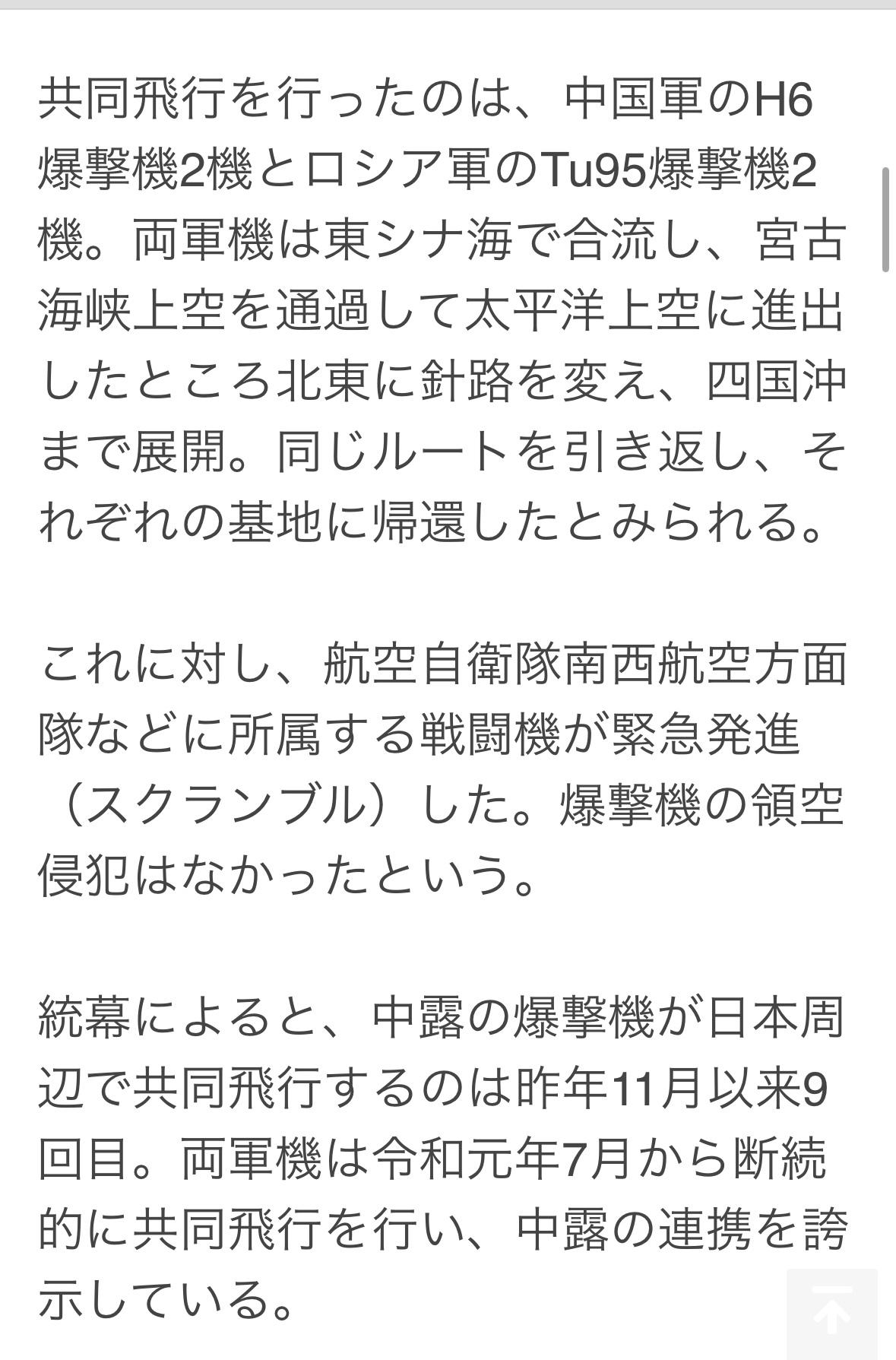 两架H6轰炸机和两架俄罗斯Tu-95轰炸机在东海会合,飞越宫古海峡后进入太平洋,随后转向东北方向,在四国沿海展开飞行,沿原路返回各自基地。 作为回应,日本航空自卫队西南防空部队及其他部队的战斗机紧急升空。轰炸机并未侵犯日本领空。 这是自去年11月以来,中俄轰炸机第九次在日本附近海域进行联合飞行。自2019年7月以来,两国军机已间歇性地进行联合飞行,展现了中俄之间的合作。