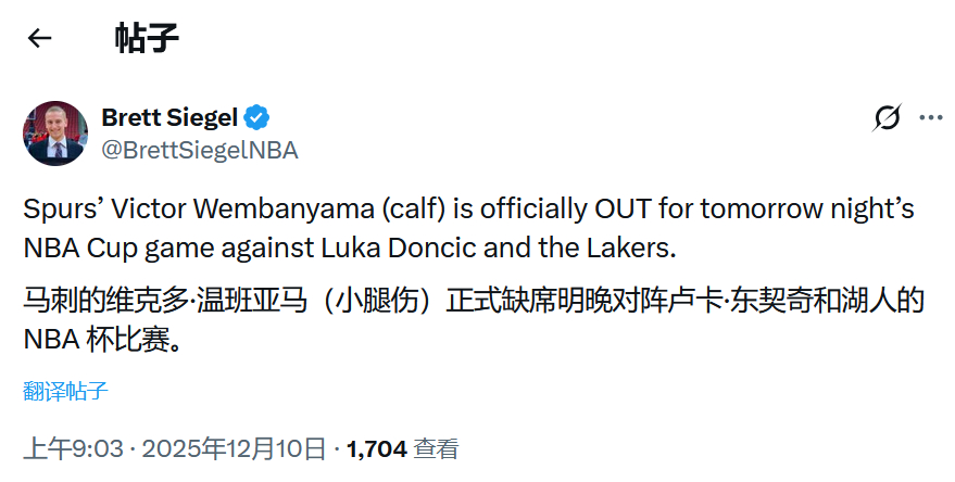 明天文班亚马将缺席对阵湖人的NBA杯赛。NBA