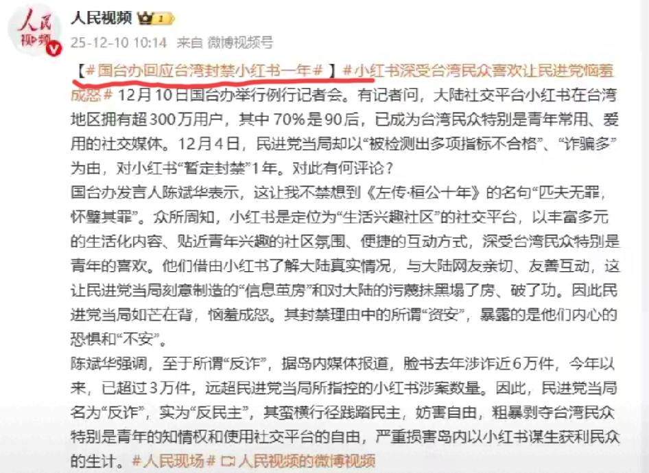 台湾封禁小红书一年? 国台办一句“匹夫无罪,怀璧其罪”,戳穿了民进党的心虚! 300万台湾用户里70%是90后,大家靠小红书看大陆真实生活、互动交友,这让民进党精心织的“信息茧房”直接破功。 所谓“资安风险”“诈骗多”全是借口,要论诈骗,脸书一年涉诈近6万件,小红书根本排不上号。 说白了,民进党就是怕台湾年轻人看清真相,怕两岸民间感情越来越近。 他们宁愿当“民禁党”,禁完购物平台禁社交软件,也不愿让民众有知情权。 可越禁越说明心虚,“代查小红书”成热词、APP下载量反升,就是最好的证明。真要为民众好,该禁的是谎言,不是两岸交流的渠道。 你觉得民进党这波封禁能挡住两岸青年相知相交吗?来评论区聊聊~台湾小红书 小红书禁封 小红书账号异常 小红书账号安全 小红书海外用户 小红书封杀 美国转战小红书