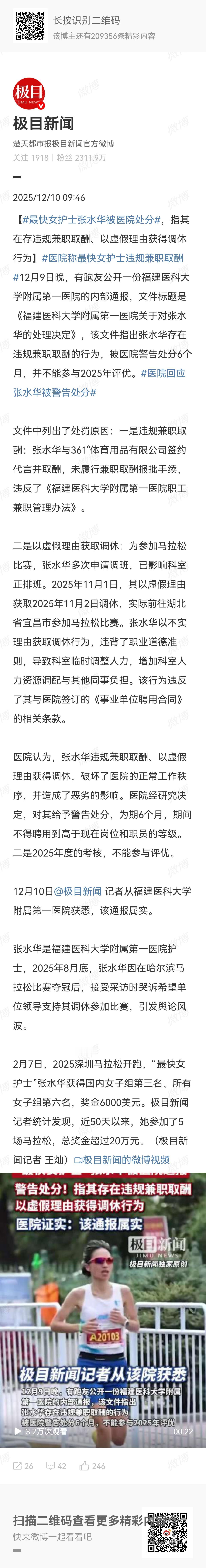 最快护士张水华,2025年8月参加马拉松比赛的时候,在网上内涵同事,说大家不支持她调休参加马拉松。当时大家就猜测,她迟早会被反噬,会被单位和同事惩治。果不其然,这才过去三个月,张水华已经收到了所在单位的处分。12月9日,福建医科大学附属第一医院发出内部通报《福建医科大学附属第一医院关于对张水华的处理决定》,对于张水华存在违规兼职取酬行为,被医院警告处分6个月,并不能参与2025年评优。看到这份处分决定,很多网友认为处分很轻,应该永久取消评优评先资格,也取消晋级资格,以后就专心跑马拉松,单位还是正常上班买社保。
