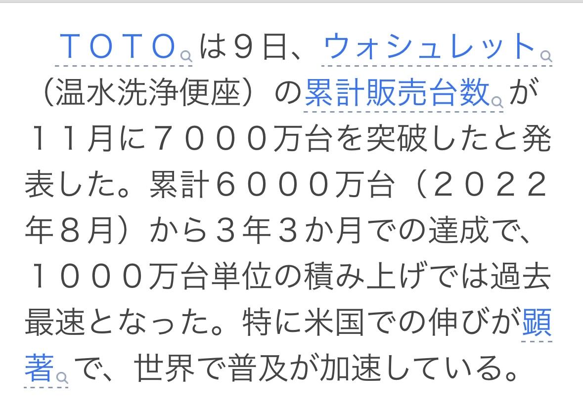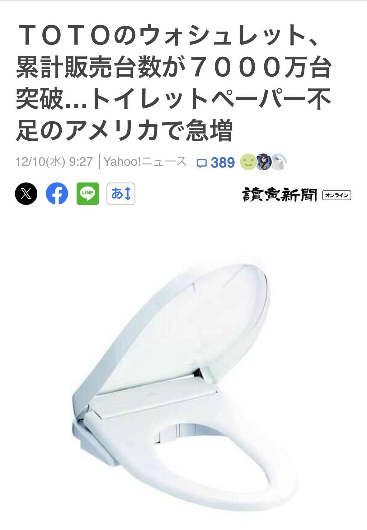 9日,TOTO宣布温水马桶座圈到11月份累计销量突破7000万台,距其销量突破6000万台仅3年零3个月,该产品在美国市场增长尤为显著,正在加速世界的普及。 产品问世于1980年,历经18年零1个月才累计达到1000万台的销量。2010年代以后在亚洲、欧洲和美国的销量开始增长,仅用了3年零8个月就从4000万台增长到5000万台,随后又在短短3年零5个月内达到6000万台。 寒冷的冬天坐在TOTO上很温暖。