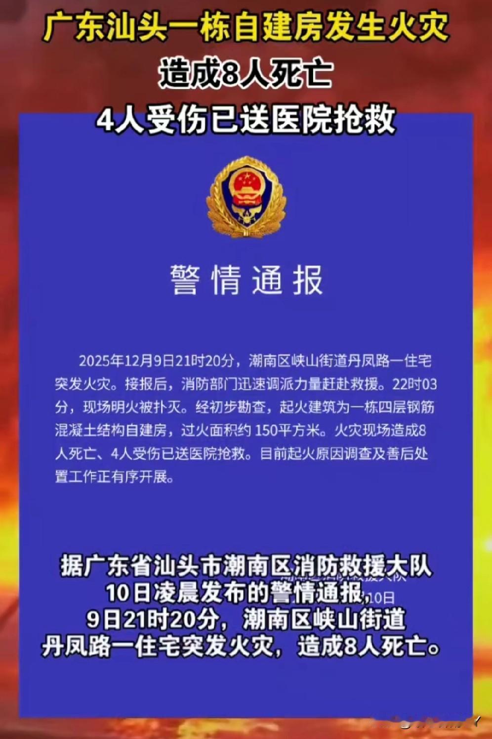 汕头自建房火灾让人痛心又沉重!12月9日21时,当地一栋四层钢筋混凝土自建房突然起火。 深夜时分,屋内人员大多已休息,火势迅速蔓延,救援人员紧急展开处置,明火于22时被扑灭。 这场火灾,8人不幸遇难、4人受伤。伤者已被送往医院抢救,事故原因有待官方彻查。 深夜突发的火情,更让人猝不及防,既揪心又后怕。水火无情,自建房消防安全隐患不能忽视。 在此提醒大家,时刻警惕火灾风险、做好日常防护。愿悲剧不再发生,逝者安息,伤者早日康复。 医生信息来源:广东省汕头市潮阳区消防救援大队、新华社、新华网、央广网等权威媒体也进行了报道