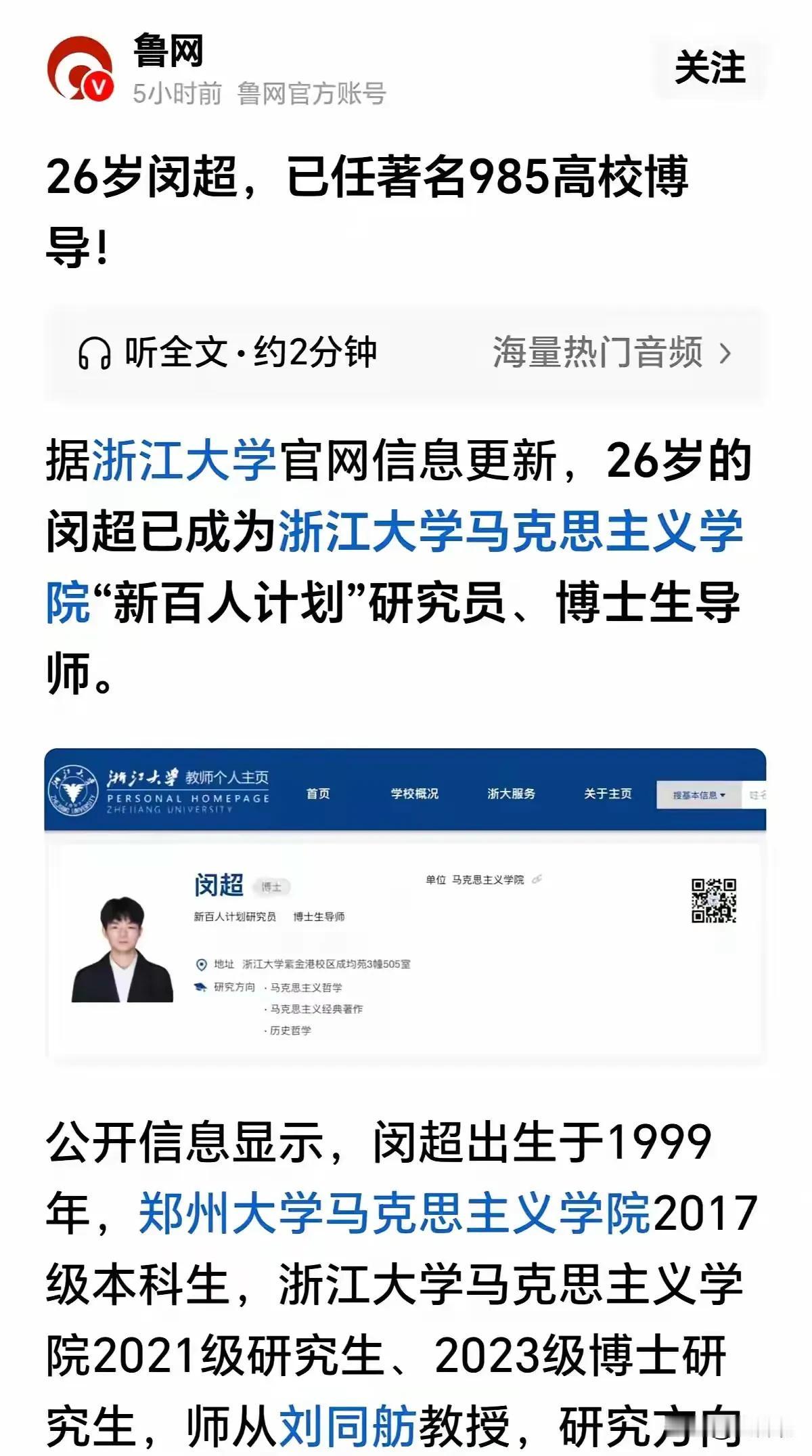 趁闵超事件的热点。浙江大学应该尽快裁减文科 近日,浙大95后博导闵超、郭敬、江佳凤等人持续引起大家关注。 我觉得这是一个契机,可以引起浙大人对于裁减文科事项的关注。 浙大为何要聘用一个博士刚毕业的年轻人,担任博士生导师,应该面对社会的疑问,一五一十地讲清楚,说明白,特别要说明这个年轻人具备博士生导师的学术能力和学术成果! 26岁,本博8年,8年里刨去吃喝拉撒睡1/3时间,再刨去听课考试写论文1/3时间,剩下3年时间,能读几本书?够什么资格当博导?请浙大回答! 这么出色的闵博导,怎么没看到他在舆论场上同恨国党开撕,同反华舆论舌战?没有看到他宣传马列主义的优秀成果?国内的文科生,现在最能打的只看到了高志凯教授,那才真的是让人觉得文科生也能为国家做出巨大贡献。