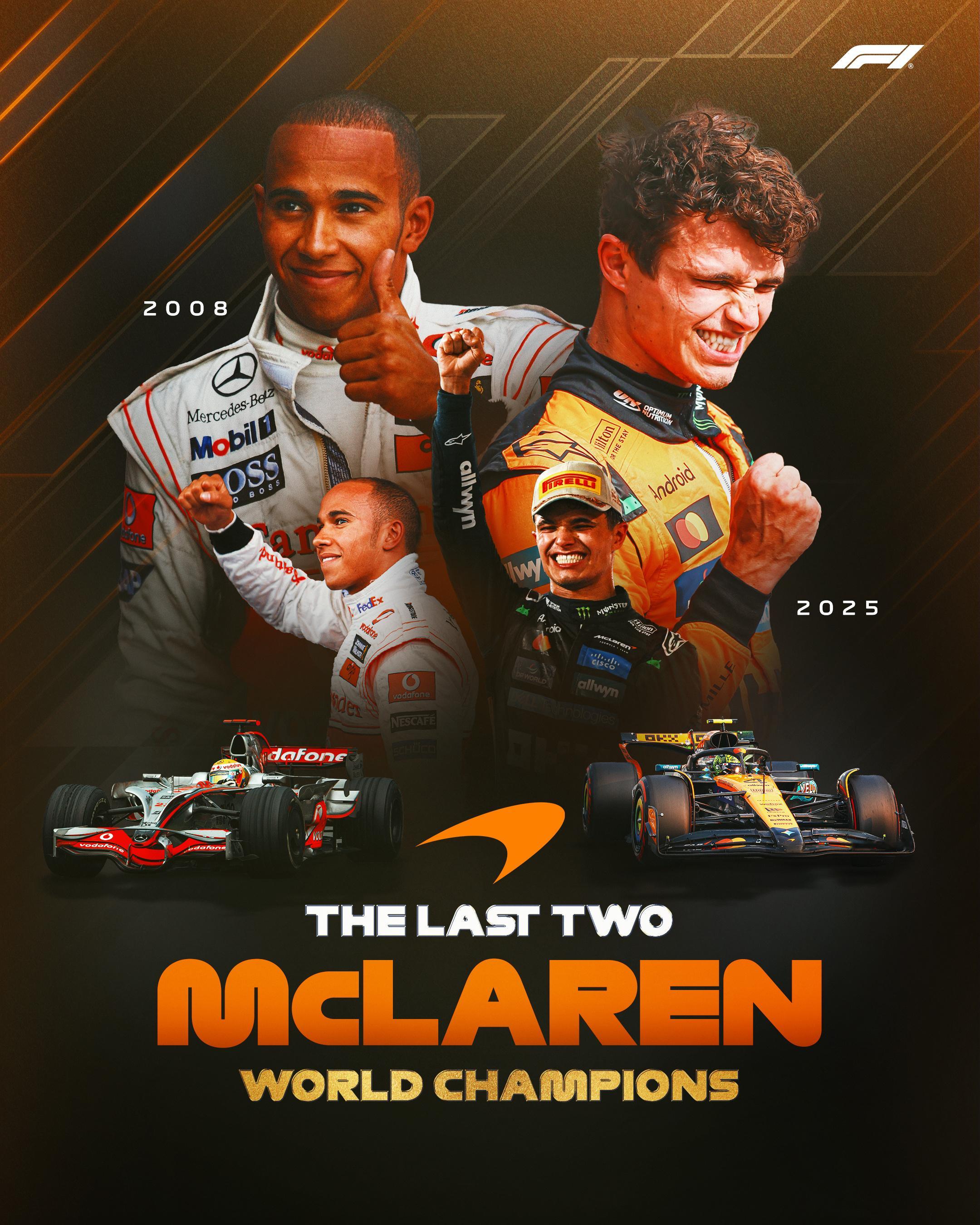 迈凯伦最近两位世界冠军的“夺冠之路”居然有着惊人的相似性~🥇 刘易斯·汉密尔顿(2008)✅️ 3月16日,墨尔本拿下赛季首胜✅️ 5月25日,摩纳哥拿下赛季第二胜✅️ 加拿大大奖赛退赛✅️ 7月6日,英国主场夺冠✅️ 赛季收官战,锁定车手世界冠军🥇 兰多·诺里斯(2025)✅️ 3月16日,墨尔本拿下赛季首胜✅️ 5月25日,摩纳哥拿下赛季第二胜✅️ 加拿大大奖赛退赛✅️ 7月6日,英国主场夺冠✅️ 赛季收官战,锁定车手世界冠军📸 F1F1迈凯伦赛车