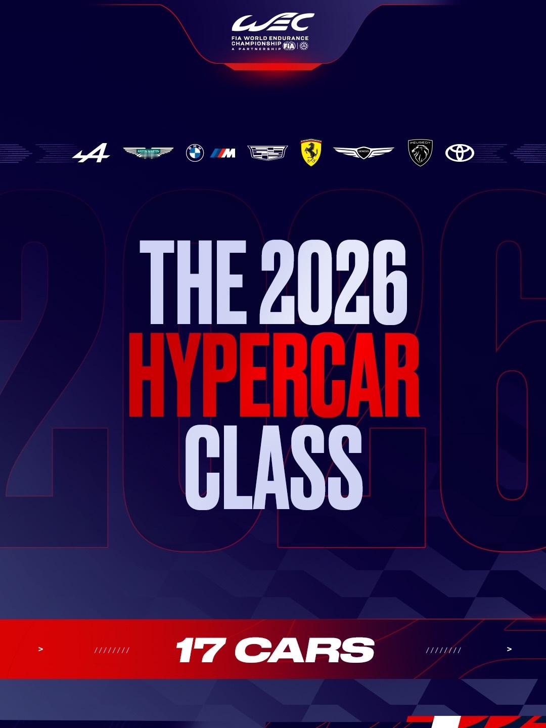 2026赛季WEC Hypercar“诸神之战”制造商一览~WEC Hypercar组的“诸神之战”来到2026赛季将进入4.0版本,尽管我们没法再看到保时捷963继续出战,但捷尼赛斯GMR-001的加入让Hypercar组继续维持八家制造商的规模。🇫🇷 Alpine A424 - 35/36🇬🇧 Aston Martin Valkyrie - 007/009🇩🇪 BMW M Hybrid V8 - 15/20🇺🇸 Cadillac V-Series.R - 12/38🇮🇹 Ferrari 499P - 50/51/83🇰🇷 Genesis GMR-001 - 17/19🇫🇷 Peugeot 9X8 - 93/94🇯🇵 Toyota GR-010 Hybrid - 7/8📈 FIA WECWEC世界耐力锦标赛赛车