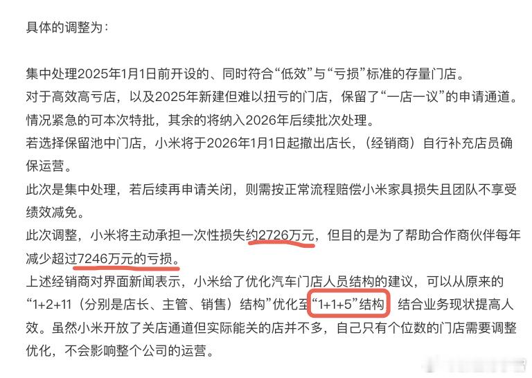 小米将承担门店调整损失约2726万元 这次主动瘦身应该也是经过系列测算吧,一次性花费 2726 万元,去减少小米合作商伙伴 7246 万元的亏损。门店的类型小米列了个标准:低效、亏损且主要为2025 年1 月 1 日前开设的存量门店。另外就是瘦身计划,从单店14人,变成单店7人。 忽然感叹,市场变化还是很快..