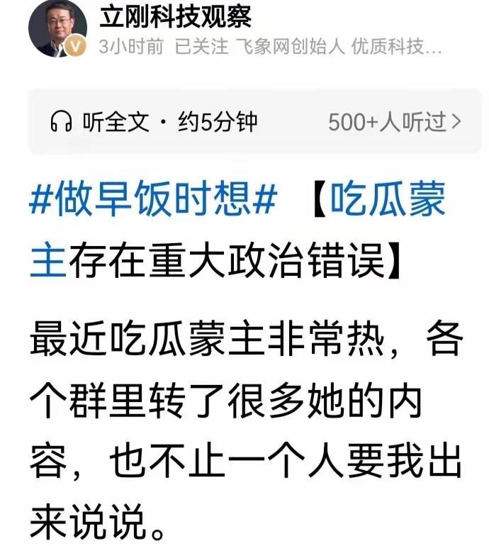 项立刚今天也跳出来批评吃瓜盟主,不过他批评的问题让人感觉他就没有真正看过萌主的视频,他应该只不过听人说过一两句话就匆匆下场开喷。 实际上对于盟主来说她论述的问题很多 包括西史辩伪,女权,红楼等等,但现在一帮人只会那一句似是而非的元清不是中国历史的话去质疑,同时鼓动一些有话语权的人下场,张捷是这样,项立刚也是这样。 不过对于这些名人来说还是耐下性多看看吧,不要被人当枪使了。