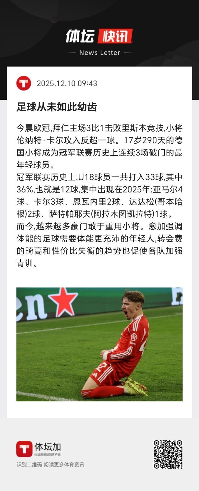 欧冠 冠军联赛历史上,U18球员一共打入33球,其中36%,也就是12球,集中出现在2025年。
