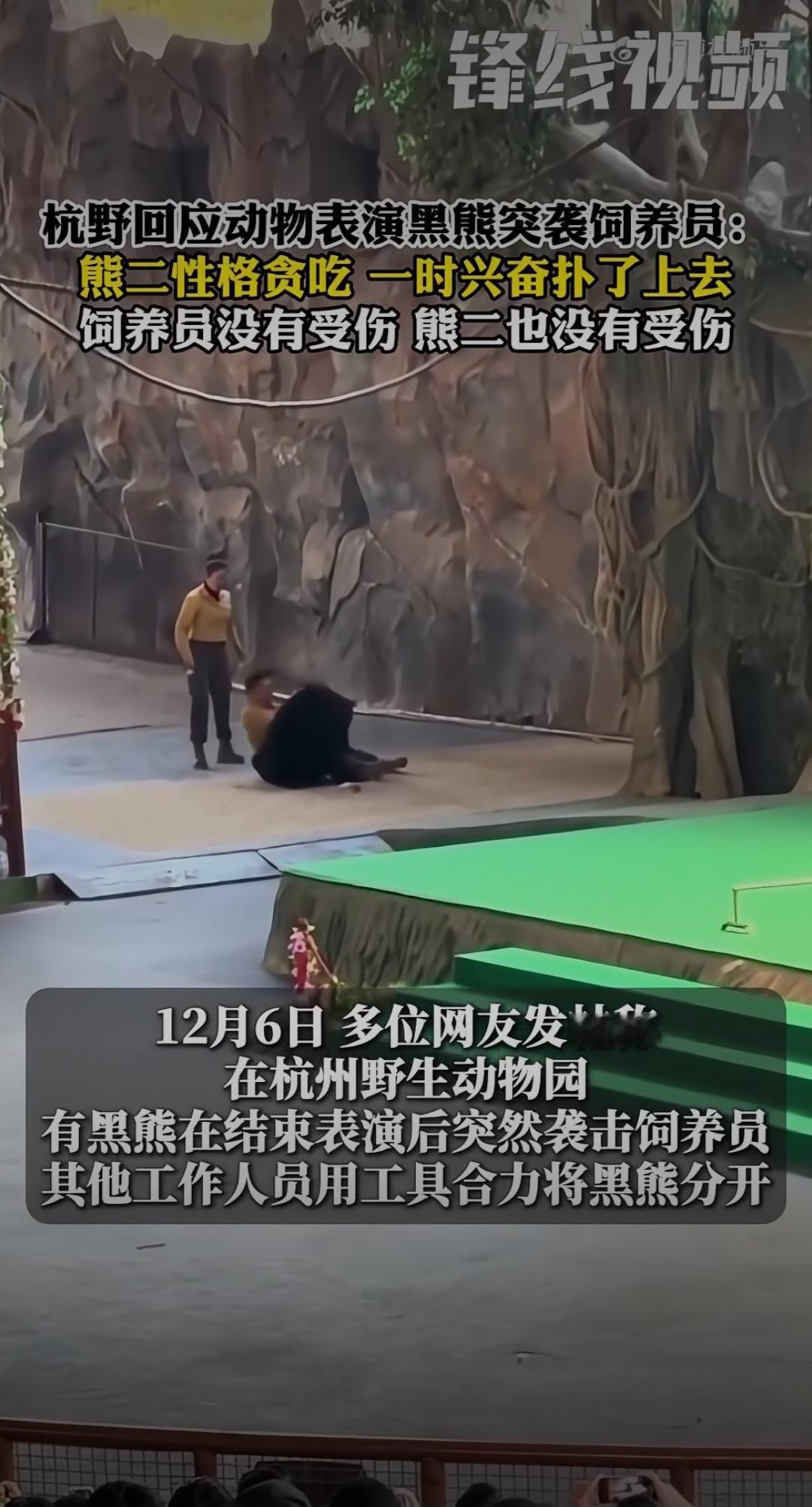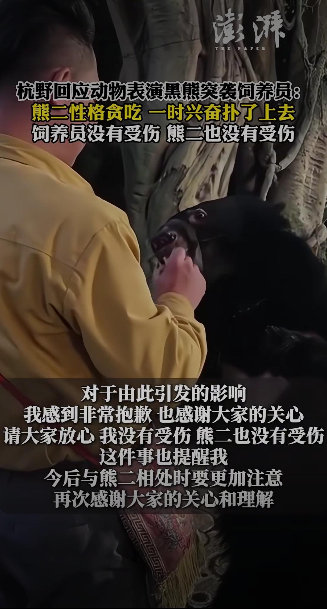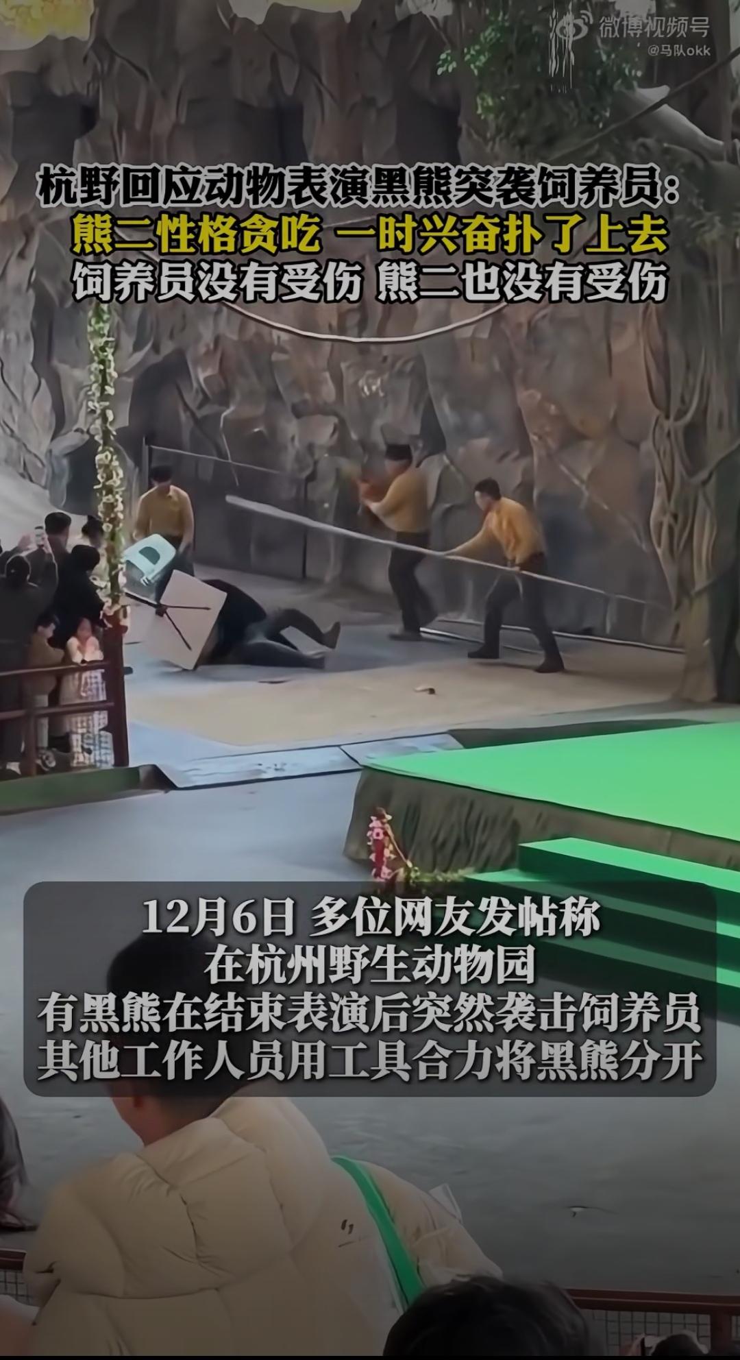 杭野黑熊突袭饲养员:一句“贪吃兴奋”,藏不住动物表演的安全漏洞!野生动物园黑熊 12月6日,杭州野生动物园的一段视频让网友捏紧了拳头:黑熊表演刚结束,突然猛地扑向饲养员,锋利的爪子瞬间撕破对方衣物,现场游客惊呼声一片,工作人员仓促拿起凳子、长杆才勉强将两者隔开。园方很快回应:“熊二贪吃,一时兴奋而已,双方都没受伤。” 可一句轻描淡写的“兴奋”,真能掩盖背后的隐患吗?视频里,表演区只有低矮护栏,饲养员与黑熊间没有任何隔离屏障,应急工具竟是普通凳子和长杆,连专业麻醉设备都没见到——这哪里是“意外”,分明是安全管理的全面失守。要知道,黑熊再“熟悉”也带着野性,发情期、表演压力、食物刺激,任何一点都可能触发攻击本能,而园方却让饲养员赤手空拳站在猛兽面前。 网友的争论戳中要害:“没受伤是幸运,不是管理到位!”“平时靠饥饿训练让动物听话,现在抢食扑人,本质是违背天性的反噬”。更让人揪心的是,这不是孤例,过往动物园猛兽伤人事件,大多源于防护缺失和对动物天性的漠视。园方把责任推给“熊二贪吃”,却避谈表演时长超时、现场投喂违规、应急体系形同虚设的问题。 动物表演的核心矛盾,从来不是“动物乖不乖”,而是“人类该不该用娱乐绑架生命”。那些看似温顺的动作背后,可能是动物的关节损伤、心理创伤;而观众追求的“近距离互动”,实则是把饲养员和自己置于险境。南京红山动物园早已取消动物表演,用生态展示还原动物天性,既安全又有意义,这才是行业该有的方向。 幸运的“无伤亡”不该成为免责理由,这次惊险瞬间更该敲响警钟。你觉得该彻底取消动物表演吗?园方该从哪些方面整改?欢迎在评论区留下看法,一起为人和动物的安全发声!