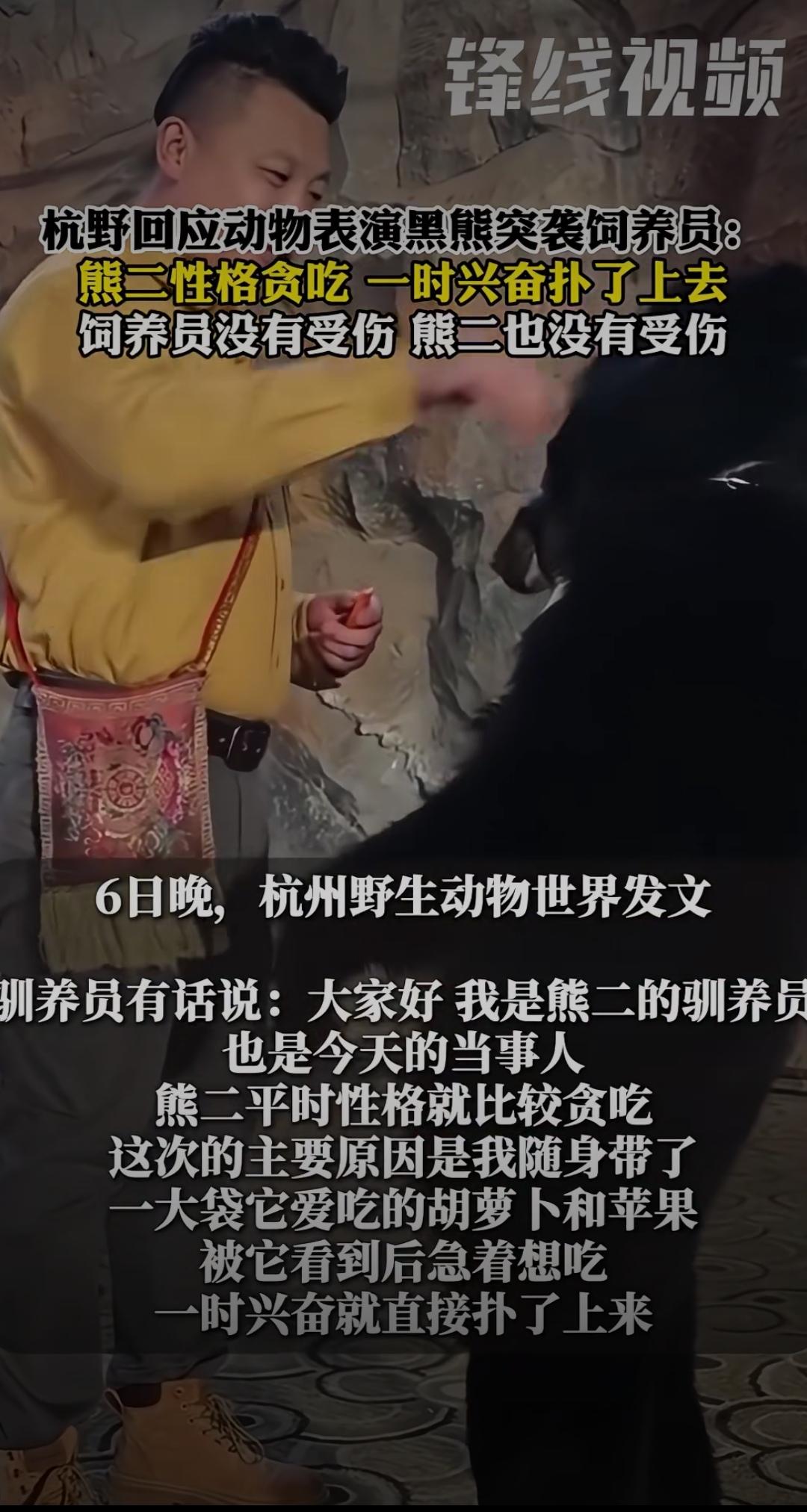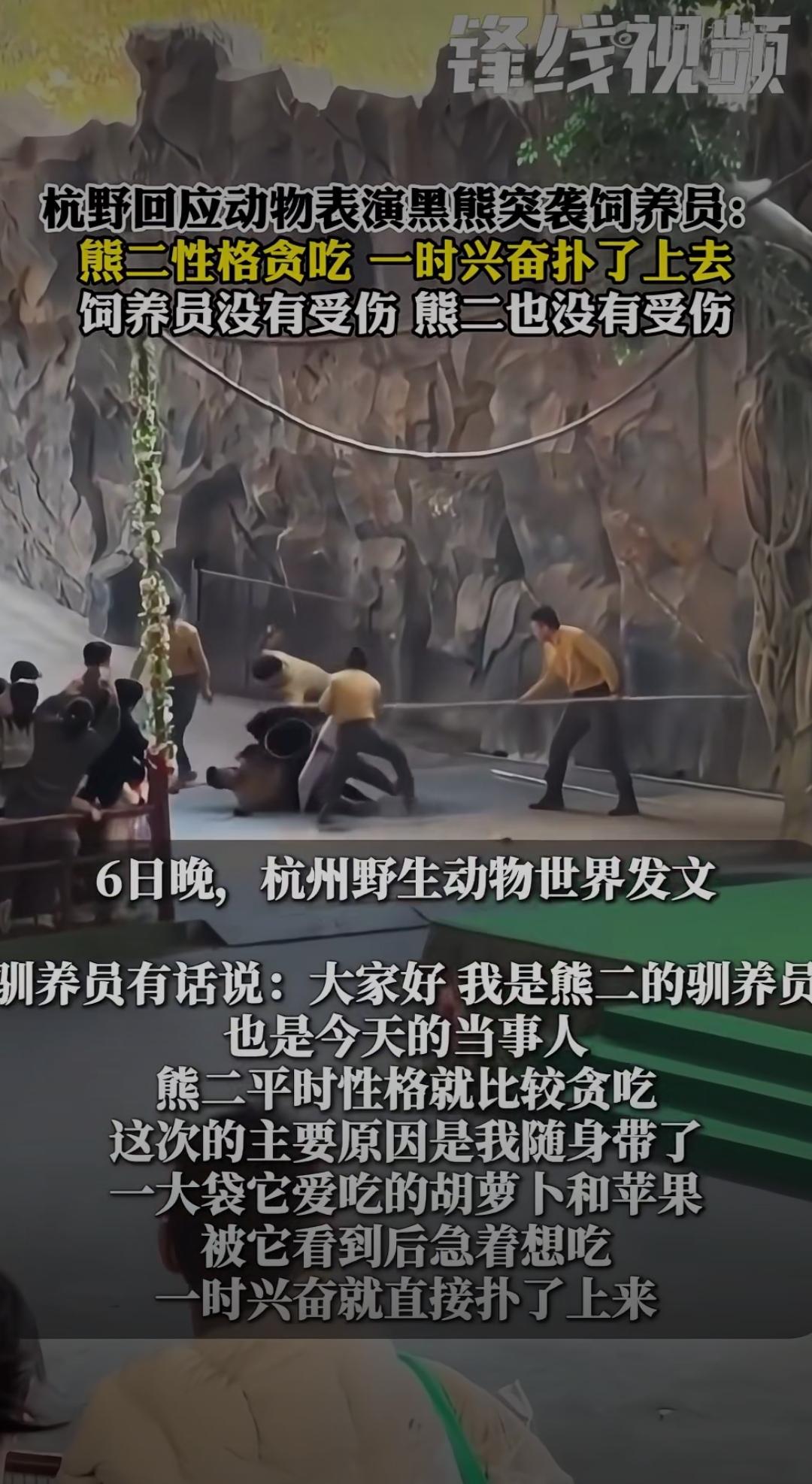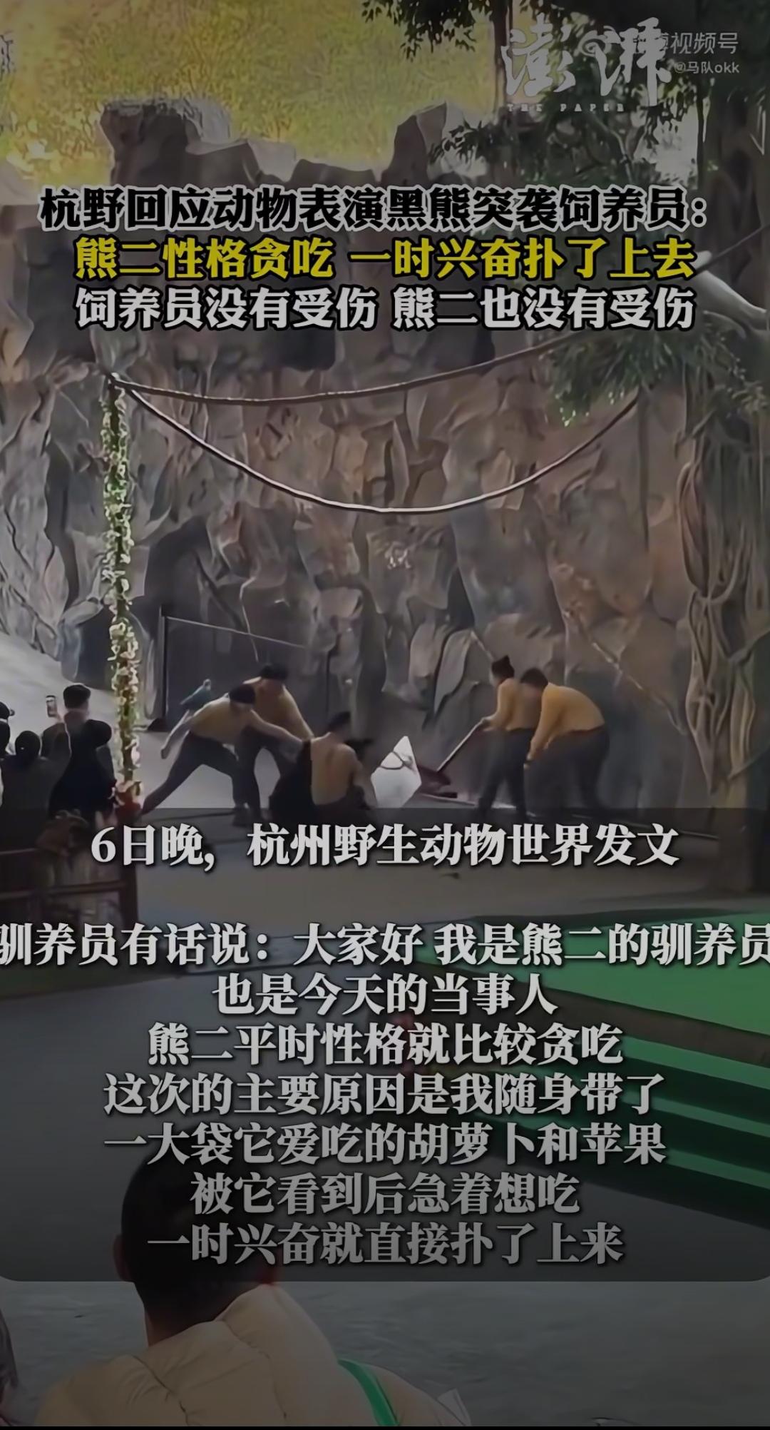 杭野黑熊突袭饲养员:一句“贪吃兴奋”,藏不住动物表演的安全漏洞!野生动物园黑熊 12月6日,杭州野生动物园的一段视频让网友捏紧了拳头:黑熊表演刚结束,突然猛地扑向饲养员,锋利的爪子瞬间撕破对方衣物,现场游客惊呼声一片,工作人员仓促拿起凳子、长杆才勉强将两者隔开。园方很快回应:“熊二贪吃,一时兴奋而已,双方都没受伤。” 可一句轻描淡写的“兴奋”,真能掩盖背后的隐患吗?视频里,表演区只有低矮护栏,饲养员与黑熊间没有任何隔离屏障,应急工具竟是普通凳子和长杆,连专业麻醉设备都没见到——这哪里是“意外”,分明是安全管理的全面失守。要知道,黑熊再“熟悉”也带着野性,发情期、表演压力、食物刺激,任何一点都可能触发攻击本能,而园方却让饲养员赤手空拳站在猛兽面前。 网友的争论戳中要害:“没受伤是幸运,不是管理到位!”“平时靠饥饿训练让动物听话,现在抢食扑人,本质是违背天性的反噬”。更让人揪心的是,这不是孤例,过往动物园猛兽伤人事件,大多源于防护缺失和对动物天性的漠视。园方把责任推给“熊二贪吃”,却避谈表演时长超时、现场投喂违规、应急体系形同虚设的问题。 动物表演的核心矛盾,从来不是“动物乖不乖”,而是“人类该不该用娱乐绑架生命”。那些看似温顺的动作背后,可能是动物的关节损伤、心理创伤;而观众追求的“近距离互动”,实则是把饲养员和自己置于险境。南京红山动物园早已取消动物表演,用生态展示还原动物天性,既安全又有意义,这才是行业该有的方向。 幸运的“无伤亡”不该成为免责理由,这次惊险瞬间更该敲响警钟。你觉得该彻底取消动物表演吗?园方该从哪些方面整改?欢迎在评论区留下看法,一起为人和动物的安全发声!