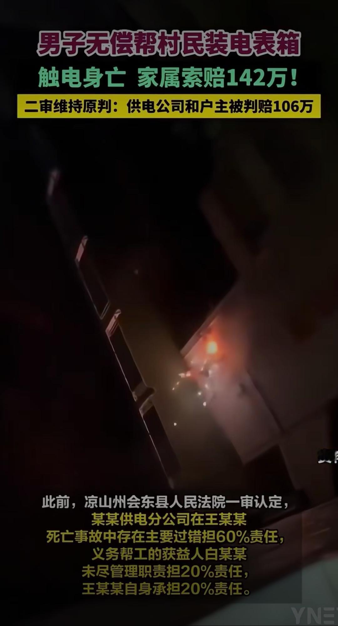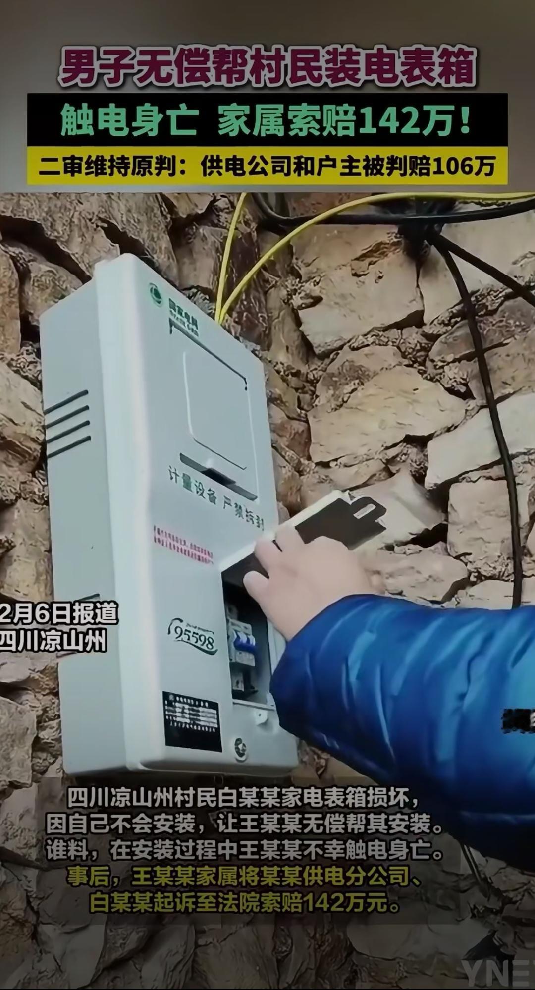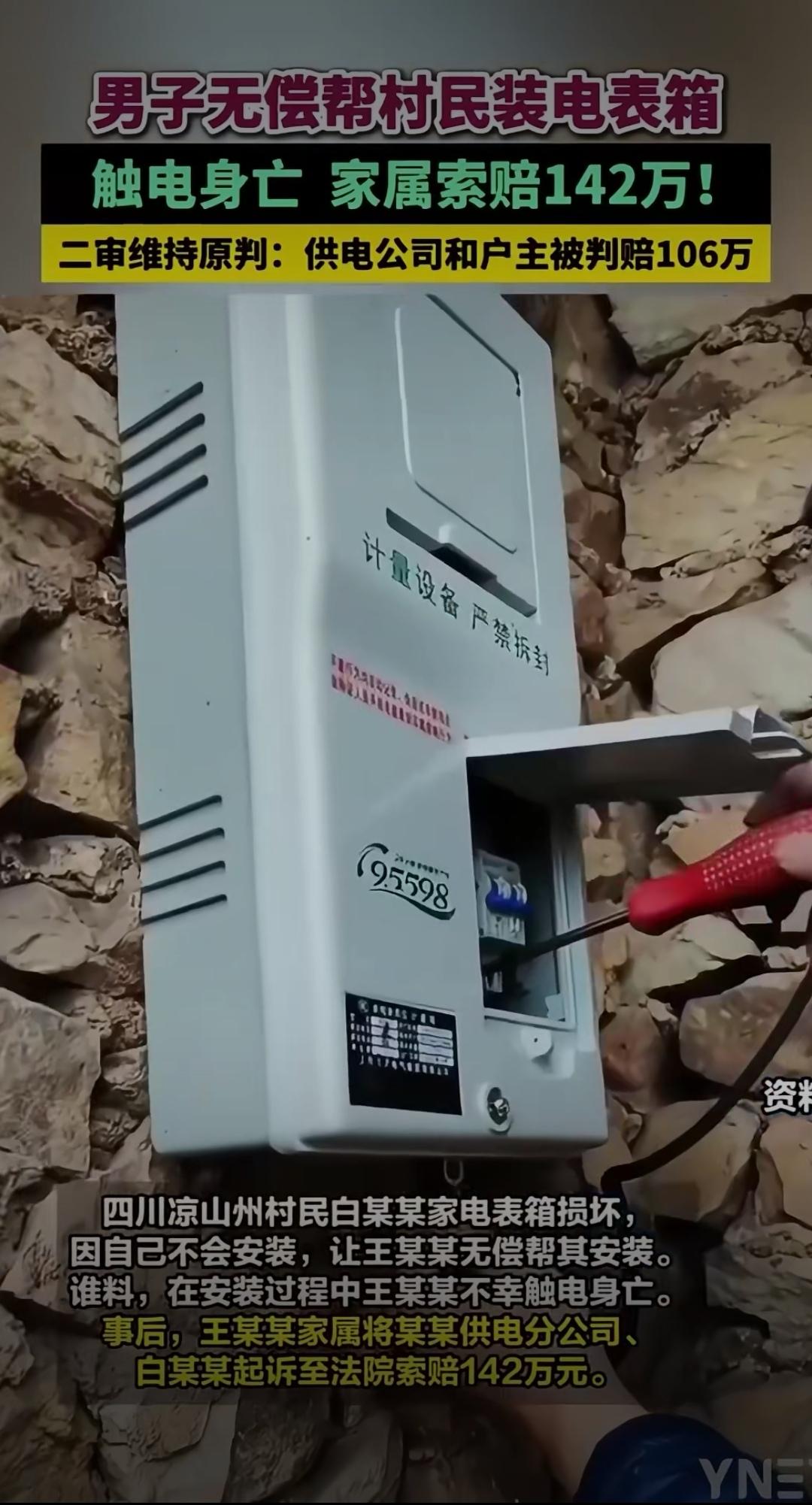 无偿帮装电表箱触电身亡,106万赔偿背后:三层责任失守,善意不该用生命买单!责任失守酿大祸 “乡里乡亲搭把手”本是农村最暖心的互助,可四川凉山的王某某怎么也想不到,一次无偿帮村民装电表箱的善举,竟让自己付出了生命代价。家属索赔142万,二审最终判决供电公司和户主共赔106万,这张判决书的背后,藏着三个扎心的真相,戳痛了无数人。 事件的根源早有伏笔:农网改造时工程队操作失误导致电表箱损坏,户主白某某求助供电公司,对方只给了新表箱,却在明知其不会安装的情况下,甩下“等工程队或自己装”的模糊答复。白某某转头找了王某某无偿帮忙,施工中王某某已明确告知“电表线漏电”,可白某某只是按供电公司指引领取材料,并未制止,最终悲剧发生。 供电公司60%的主责,赔的是“甩锅式服务”。作为电表箱的产权方和维护者,本应主动上门处理安全隐患,却把专业风险转嫁给普通村民,省下一次上门服务,换来一条人命的代价。户主20%的责任,戳穿了“人情大于安全”的误区——明知漏电仍让帮工者继续,免费帮忙从来不是漠视安全的借口。而王某某自担的20%,更是给所有人敲响警钟:善意值得肯定,但面对漏电隐患凭侥幸蛮干,就是给危险留了可乘之机。 网友的评论字字揪心:“好心帮人却丧命,太让人惋惜!”“供电公司的责任根本推不掉,安全能随便甩锅吗?”“以后帮人也得先顾着自己安全啊!” 这起悲剧本可避免:供电公司多一份主动,户主多一份谨慎,王某某多一份警惕,就能守住生命底线。 善意从不是风险的挡箭牌,安全也从来没有“人情例外”。这106万赔偿,是对逝者的告慰,更是对所有责任方的警示。你觉得这份判决合理吗?遇到类似帮工场景,你会怎么保护自己?欢迎在评论区聊聊!