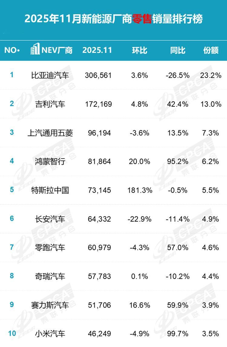 乘联分会发布了2025年11月新能源厂商零售销量排行榜,比亚迪排第一,小米仅落后赛力斯1位,挤进了前十。