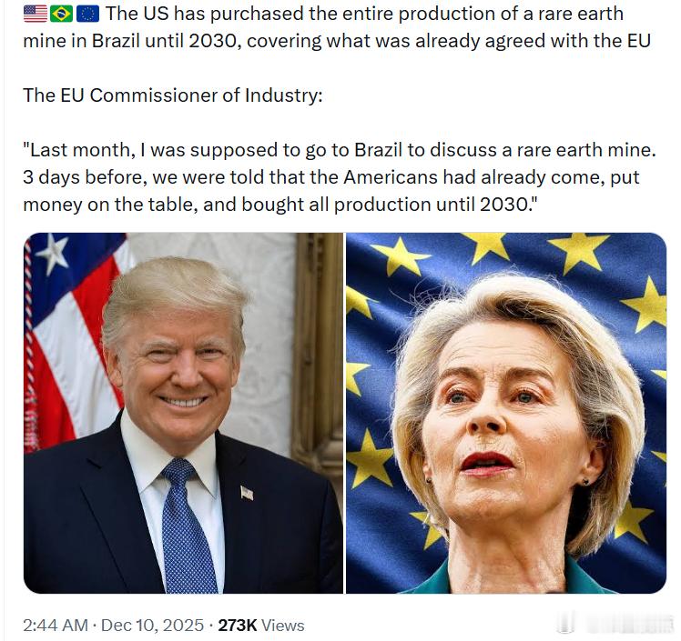 美国已购买巴西一家稀土矿的全部产量,直至2030年,涵盖了此前与欧盟已达成的协议。欧盟工业专员表示:“上个月,我原本计划前往巴西讨论一处稀土矿的事宜。就在三天前,我们被告知,美国人已经来了,把钱放到桌上,并购买了直到2030年的全部产量。”