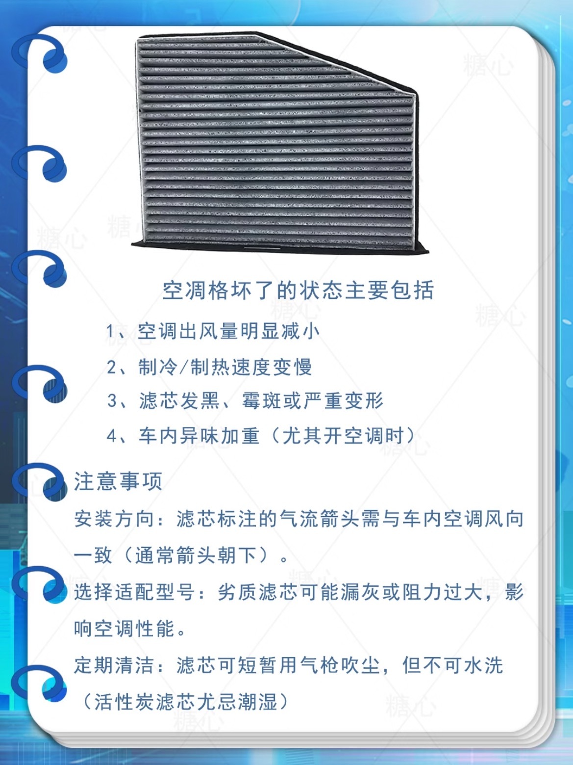 为什么我的车干干净净🤔但开空调总觉得风小、有异味?🚗可能是你的“空调格”该换了!🥹🛠️ 空调滤芯是什么?相当于车的“口罩”,过滤进入车内的空气,阻挡灰尘、花粉、PM2.5甚至细菌,保护你和家人的呼吸健康。⚠️ 坏了的表现:1️⃣ 出风量明显变小2️⃣ 制冷/制热速度变慢3️⃣ 开空调有霉味、异味4️⃣ 滤芯肉眼可见发黑、有霉斑🔄 更换建议:周期:一般1万公里或1年,北方沙尘多/南方潮湿地区建议缩短选择:带活性炭的滤芯吸附异味效果更好安装:注意箭头方向(通常朝下),装反影响效果我与汽车的日常大v聊车