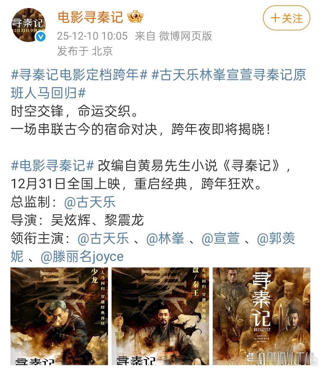 终于,古天乐林峯主演的电影《寻秦记》官宣定档12月31日。