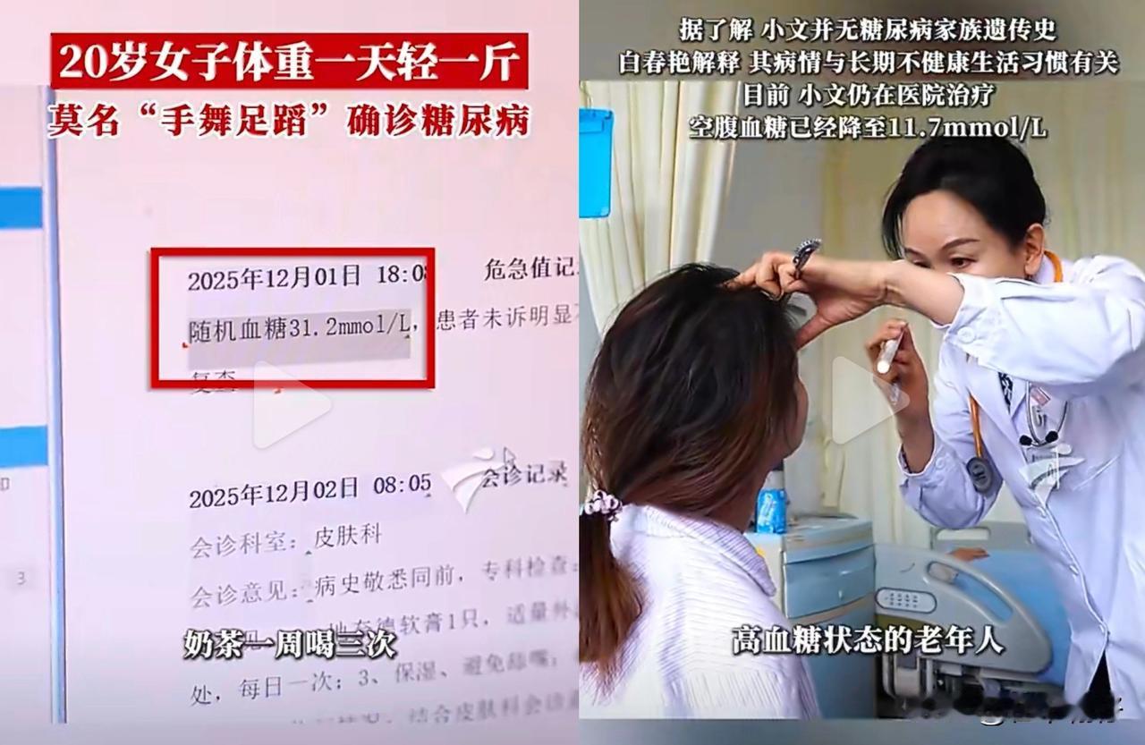 深圳一名20岁女子小文因突发肢体不自主舞动的罕见症状就医,确诊为"糖尿病非酮症偏身舞蹈病",其日均一餐、每周3次奶茶加长期熬夜的生活模式引发广泛关注。 小文并无糖尿病家族遗传史,医生明确指出,他的病情与长期不健康的生活习惯密切相关。截至12月9日,小文仍在医院治疗。 一周喝三杯奶茶不是关键,关键是一天只吃一顿…就算没有糖尿病也有其他病,糖尿病是多重因素叠加的结果,奶茶仅是代谢崩塌的催化剂之一。偶尔喝一杯解解馋没问题,但千万别把奶茶当日常饮品,更不能用它代替正餐!