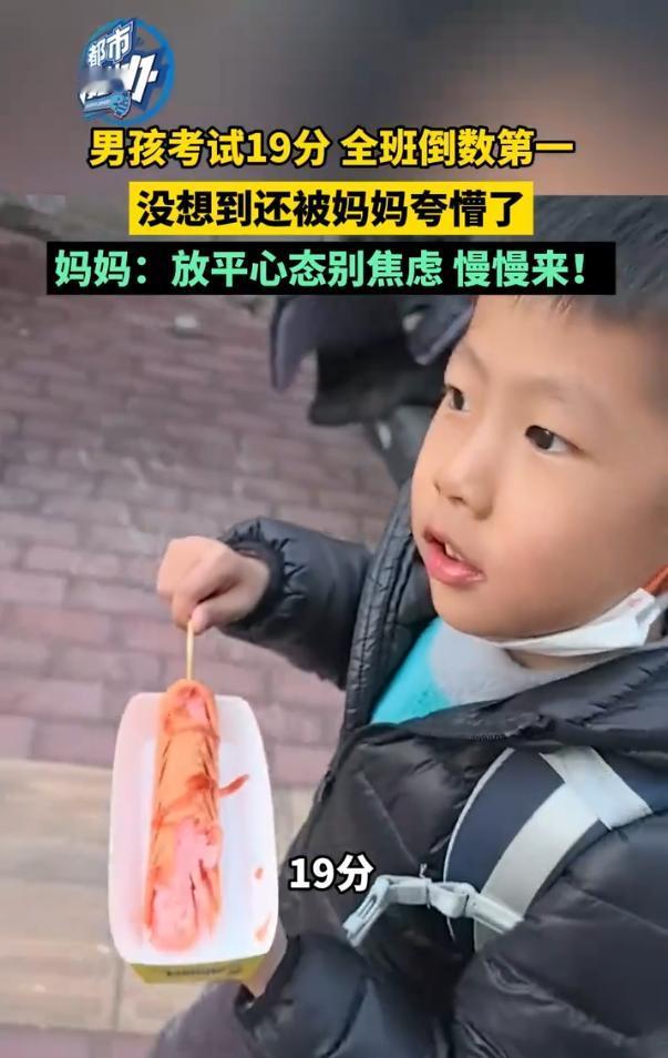 近日,湖北一男孩放学和妈妈聊天,被问到考试成绩时,不好意思地说考了19分。没想到妈妈竟然说“这么高”,男孩直接被妈妈夸懵了。 网友评论: 孩子健康成长,心态好,就可以了。将来学一门技术,做一个大国工匠,没有什么不好的 我们小时候就是这样,自己上学,妈妈叮嘱,在学校注意安全,不要考0蛋。然后我第一次考试考了49分,我是一路唱回去的。后来才知道60分及格。也觉得很不好意思,妈妈说没事,只要努力就可以了。后来成绩就一路飙升。现在想想对自己孩子的要求,果然是活成了自己讨厌的样子。 这家伙多幸福,考试19分,妈妈不责怪他,还给他买烤肠吃,还安慰他“没事” 倒数第一这有什么大不了的,孩子身体健康心理健康就可以,我小时候也是倒数第一考了8分,爸妈从来没说过一句,考试结果这只是目前情况不代表以后怎样,现在不一样是行业领军人才。从刚怀孕开始只期待孩子健康生下来,生下来只期待健康长大,长大后还期待上学怎样,大学毕业又期待工作好待遇高,还期待幸福家庭,扪心自问一生追求的是什么和想要什么,缘木求鱼不可取,每种花都有各自花期,还有大树和小草,不能绝对化,开心就好 记得18年的时候 下班回家路上前面一对母子 妈妈劈头盖脸的批评她儿子 小朋友低着头走了一路 妈妈批评孩子只考了96分 我心里想还想怎样都96分了 小朋友可怜