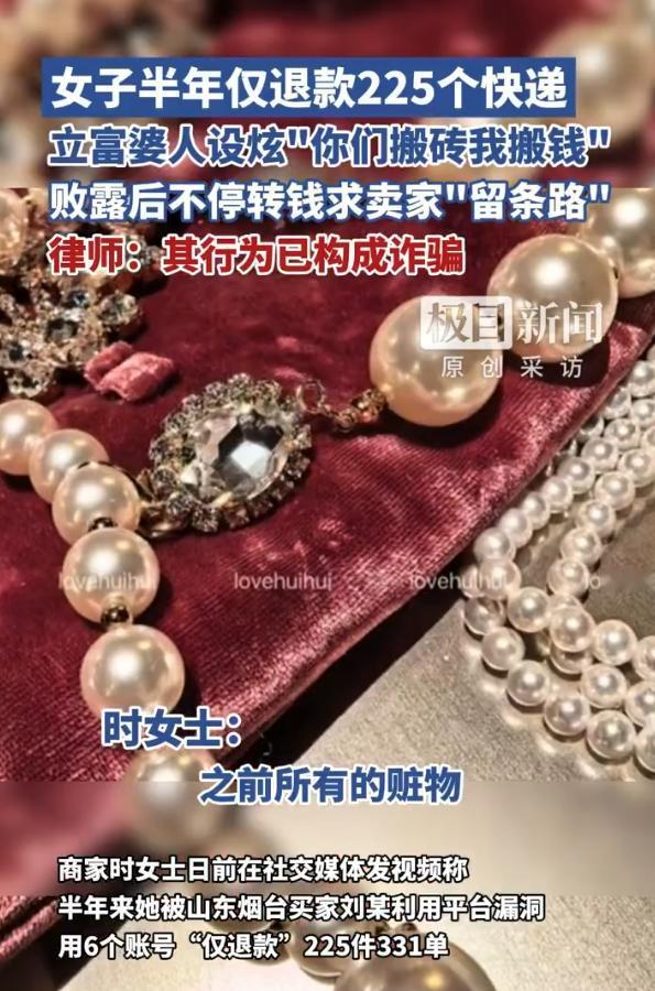 时女士在社交媒体发视频称,半年来她被山东烟台买家刘某利用平台漏洞,用多个账号“仅退款”225件,致她损失5.4万余元。 刘某以诈骗手段累计下单556单,涉案金额高达9万元。最初她以为只是普通“羊毛”,却未想是持续已久的诈骗行为。 网友评论: 推出仅退款选项的平台,不该担责任嘛?买卖本来是你情我愿的契约 坐标郑州,网购十年了在淘宝花了也有几十万了,从来想都没想过仅退款,退货时里面的卡片都要给商家寄回去。 地域从来不该是划分善恶的标签,每个地区都有坚守底线的好人,也难免有少数失德失范的个体,不能因一个人的行为,就片面否定一个地区的所有。 仅退款,不是货物在路上还没到,没拿到商品才仅退款吗? 不懂就问,退回去的衣服质量吊牌都不一样,收货的时候商家发现不了吗 近几年黑山东的还少吗,呵呵,并且IP很固定,基本就是南方系几个省份。现在北方经济也就山东在撑着了,一个劲的黑山东,想搞垮整个北方系,这还不够明显吗。 国内互联网现在就这个德行,出点事就地域攻击,前段时间全运会都在夸山东,这事儿一出又很多人一副恍然大悟“原来是这样的地方”的恶心模样 做电商的都知道山东烟台得禁发,那边团伙作案~ 恶心的很,就得地域歧视,那些人就是给他们地区丢脸,这回上新闻更多人知道,洗白要付出代价的,恶人做什么想想后果吧
