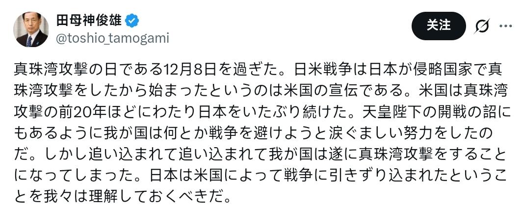 日本前航空参谋长田母神俊雄:已经过去了被称作珍珠湾攻击之日的12月8日。“日美战争是因为日本作为侵略国家偷袭了珍珠湾才开始的”这种说法,不过是美国的宣传而已。美国在珍珠湾攻击之前大约20年间,一直持续不断地折磨、逼迫日本。正如天皇陛下的开战诏书中所言,我国为了避免战争,付出了令人落泪的艰苦努力。然而,日本被逼到绝境、被逼到绝境,最终不得不实施了珍珠湾攻击。我们必须明白,日本是被美国硬拖进战争的。