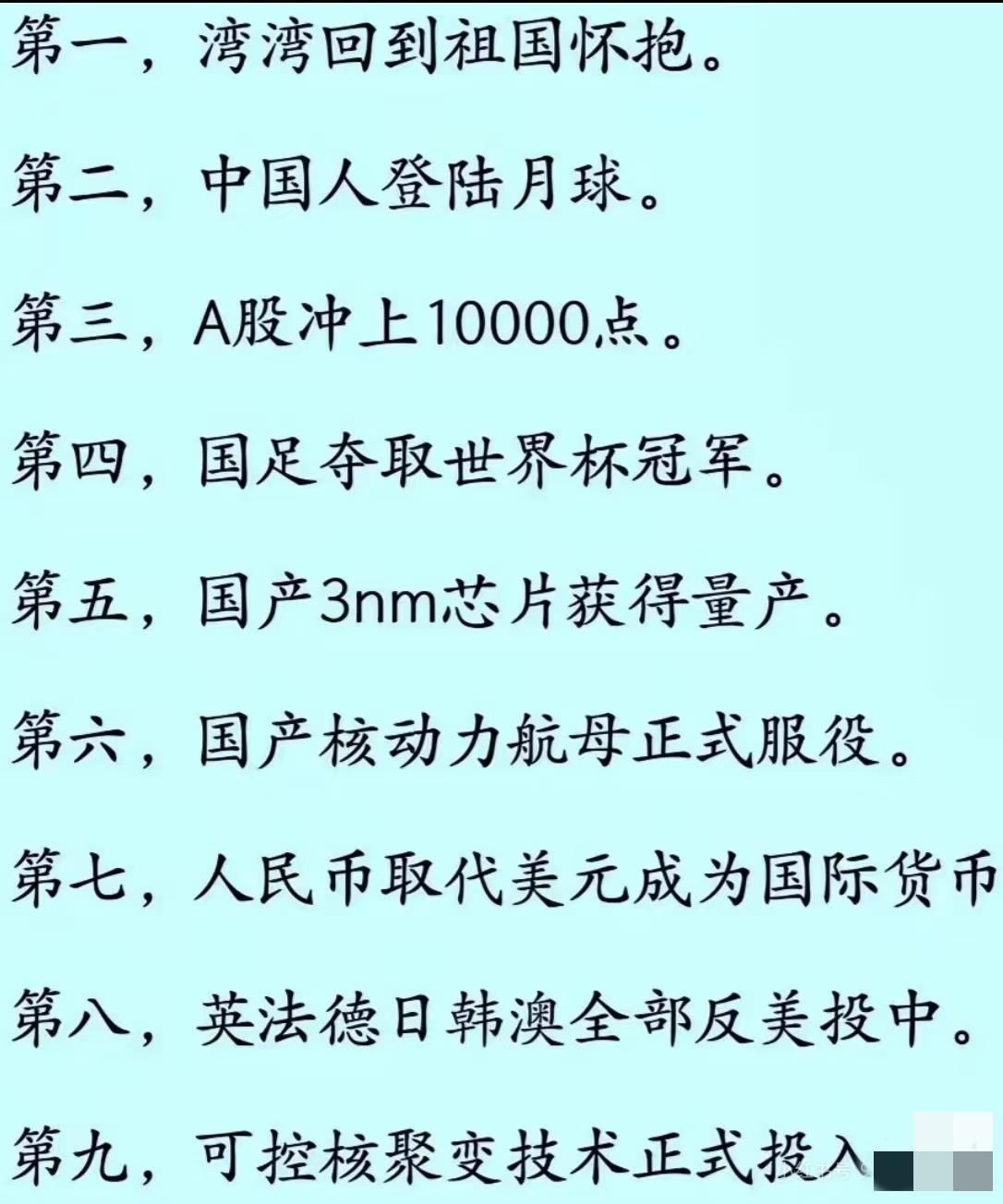这九条哪一条会最先实现?哪一条最难实现。 个人觉得,第五条、第六条、第一条、第九条比较容易实现,5-10年内应该可以完成。 最难的是第四条和第八条,中国队别说拿世界杯了,进入世界杯八年之内不知道能不能实现,而要拿到世界杯,估计这辈子是看不到了。 至于英法德这些国家全部反美投中,不大可能,毕竟文化不同。