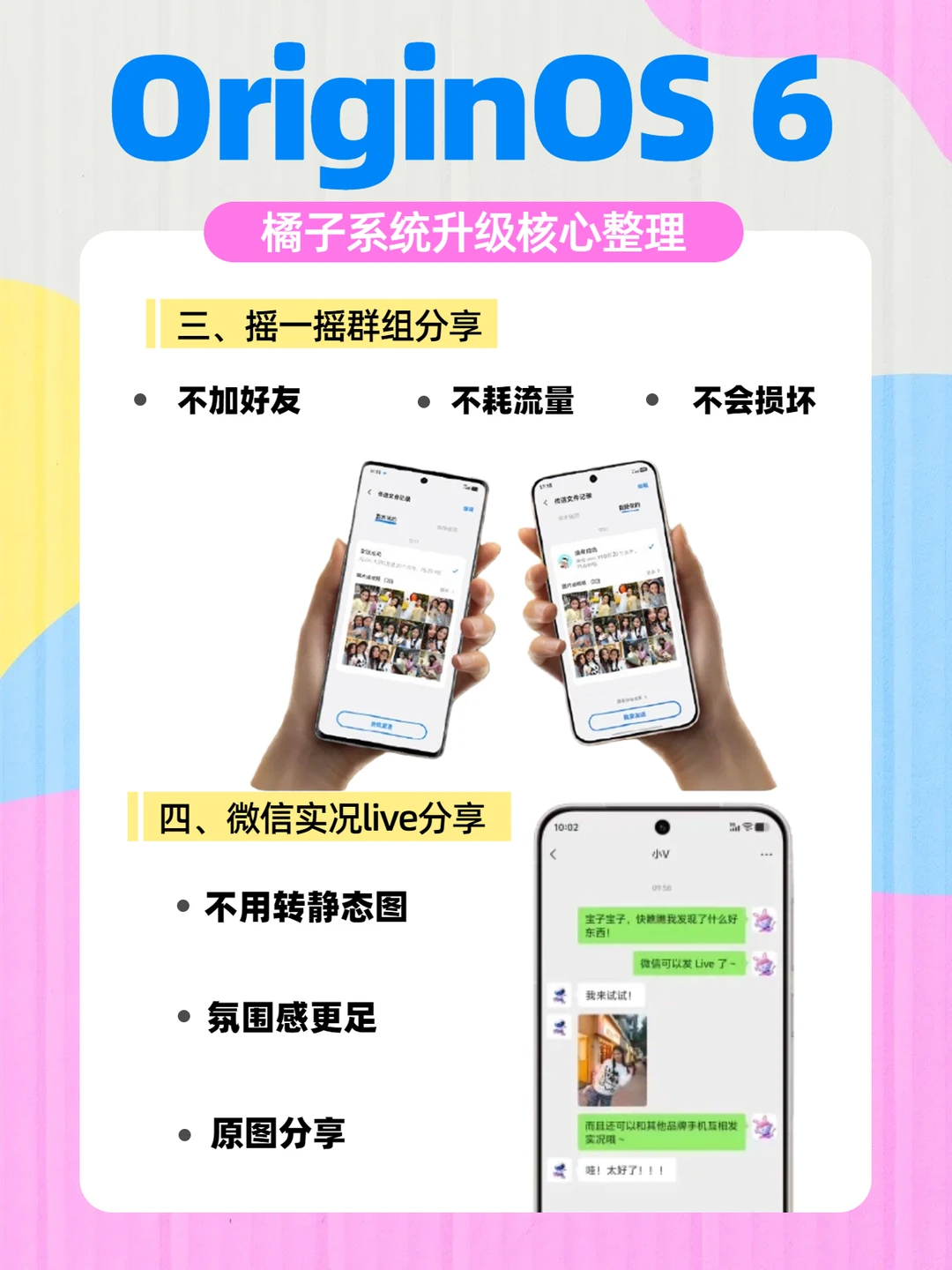 3.朋友聚会分享素材超高效!摇一摇群组分享(适配安卓13及以上vivo、iQOO机型)安排上了,和朋友同时摇一摇就能建临时群组,照片视频无损秒传,不用耗流量、不用加好友!