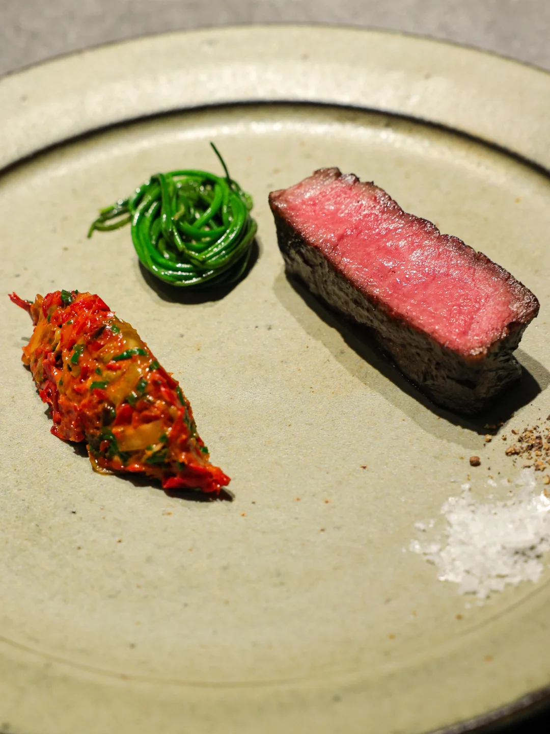 牛肉的肉感冲击力很强,吃起来也几乎不怎么费牙口,实在软嫩。一旁的辣皮子吃起来有点甜辣的感觉,搭配口感如韭黄一般的沙葱,三者一起咀嚼,非常香!