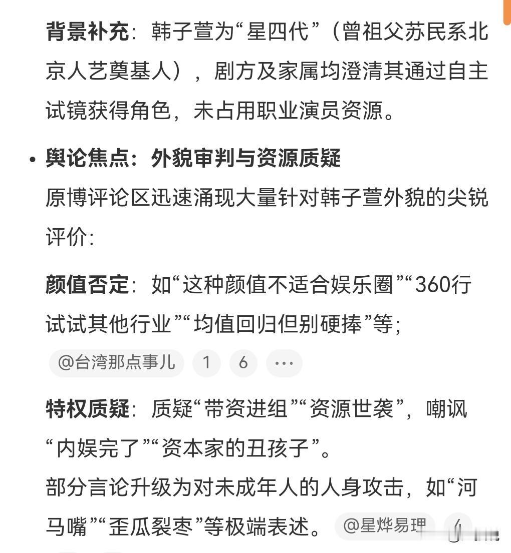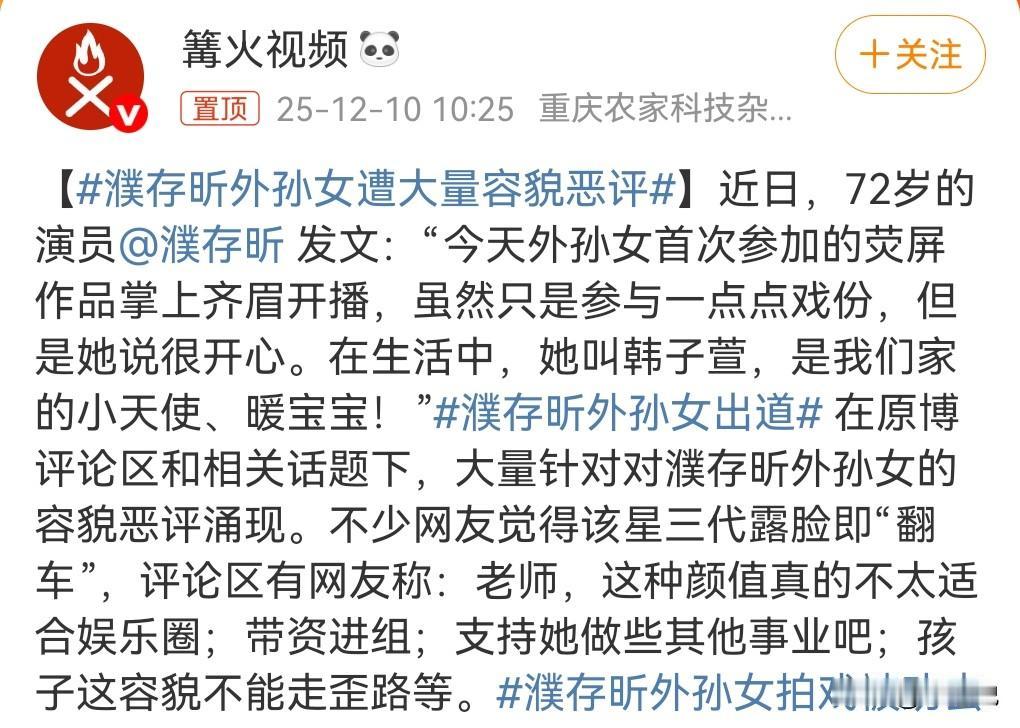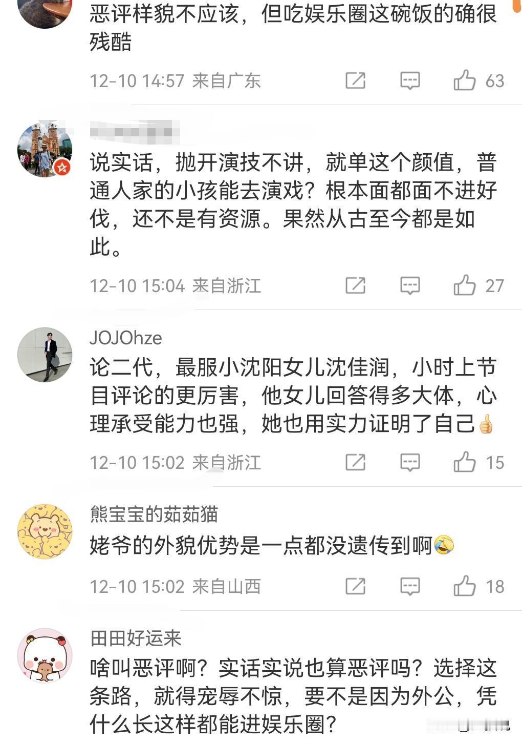 每个人都有表达自己观点的权利。 只要不是特离谱,都是能够接受。 濮存昕外孙女遭大量容貌恶评。 有人质疑,这就是个关系户,机会给她了,真正会演戏长得好的的就失去了一个机会。 不过也有人认为只要能演好就行了,颜值不重要。 可以质疑,但最好不要人身攻击。 如果有一说一,娱乐圈也是讲关系的。