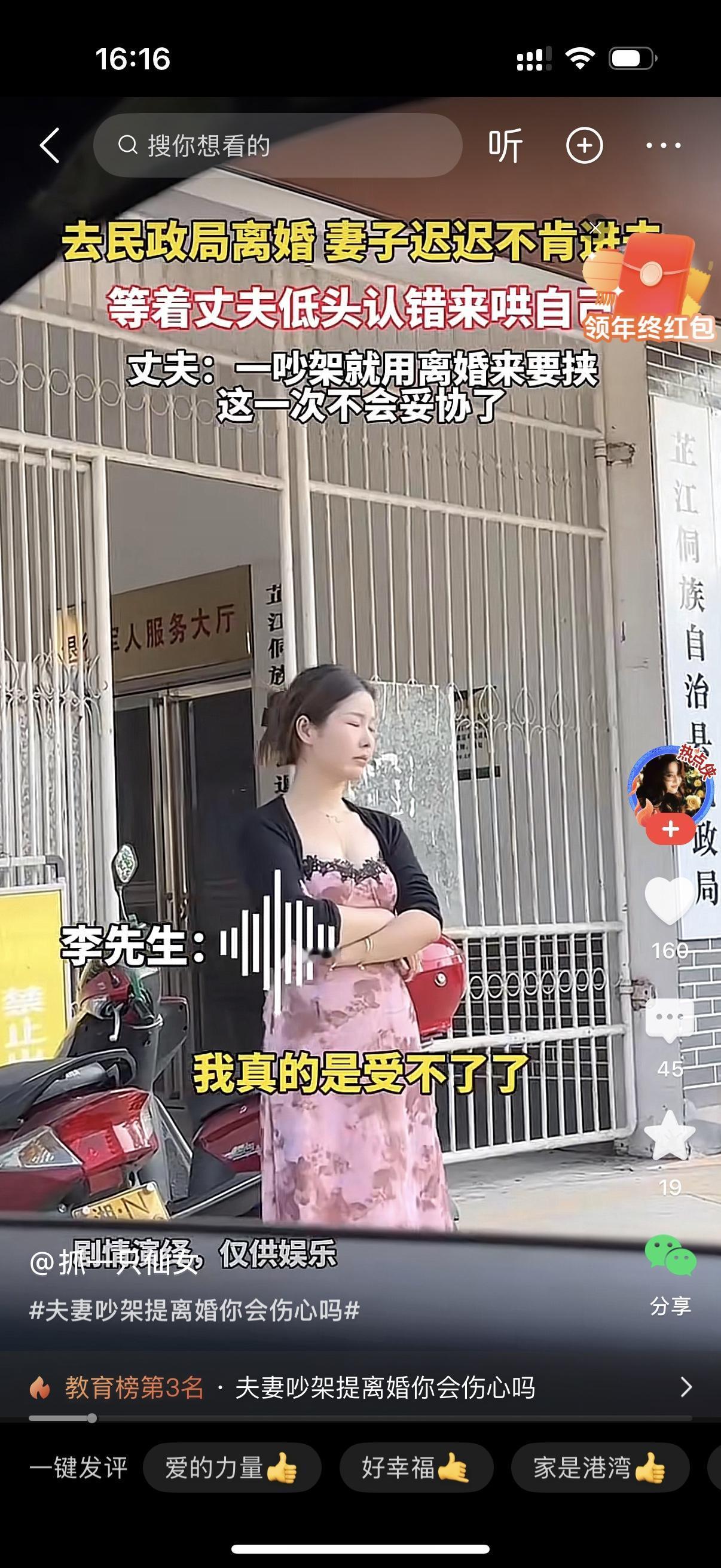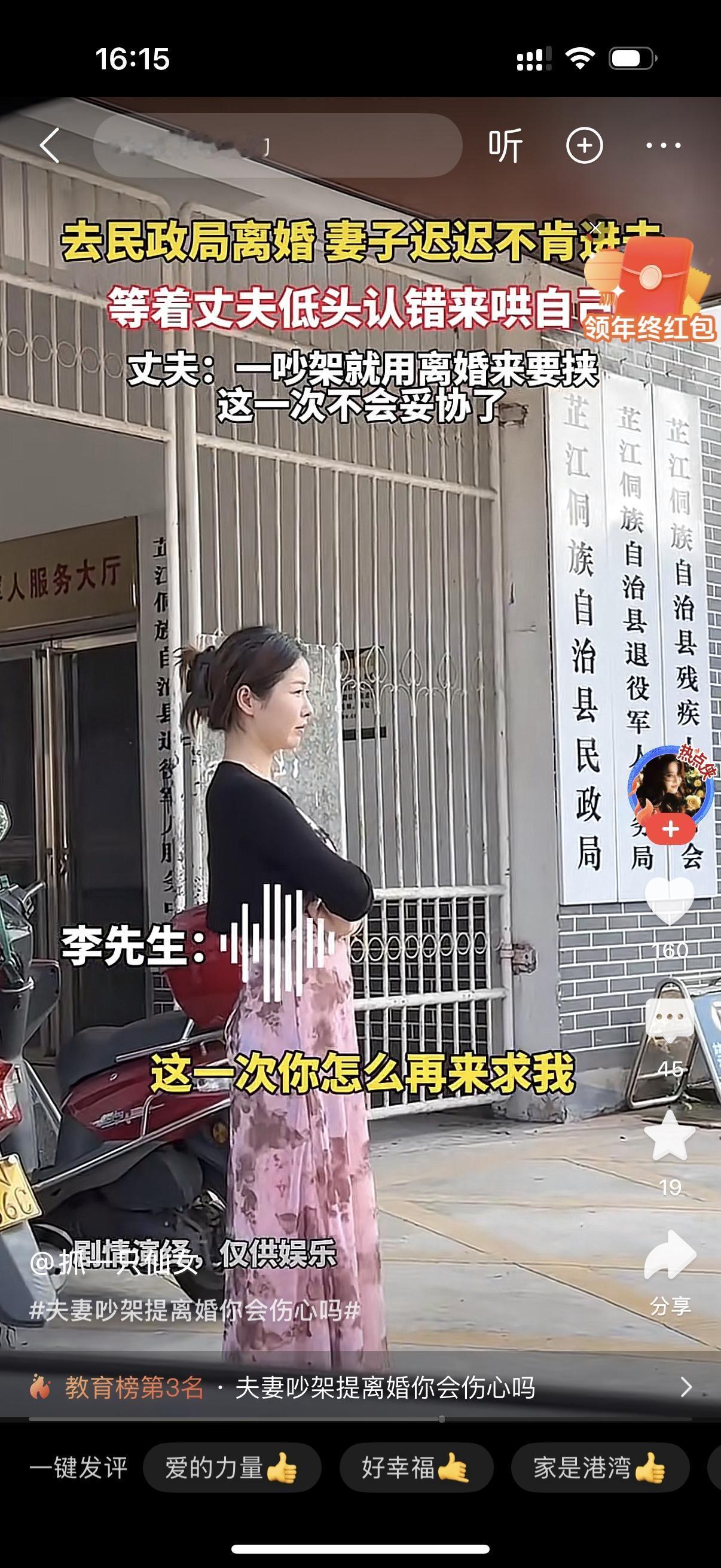 女人站在民政局的门口,迟迟不肯进去。她的丈夫早就进去了,打电话不断地催她去办离婚手续,她就是站在原地一动不动。女人的眼里满含泪水,她肯定是后悔了,她肯定还是想让男的向她妥协。男人却没有再给她这个机会,男人说自己真的受不了一个妻子成天拿离婚来威胁自己。这一次怎么来求他,他也不会妥协。男人说女人在家啥都不干,所有家务都是男的做,男人说她一句,女人就炸毛,就说男的不爱她,她要离婚。女人太作,男人总有忍不了你的那天。