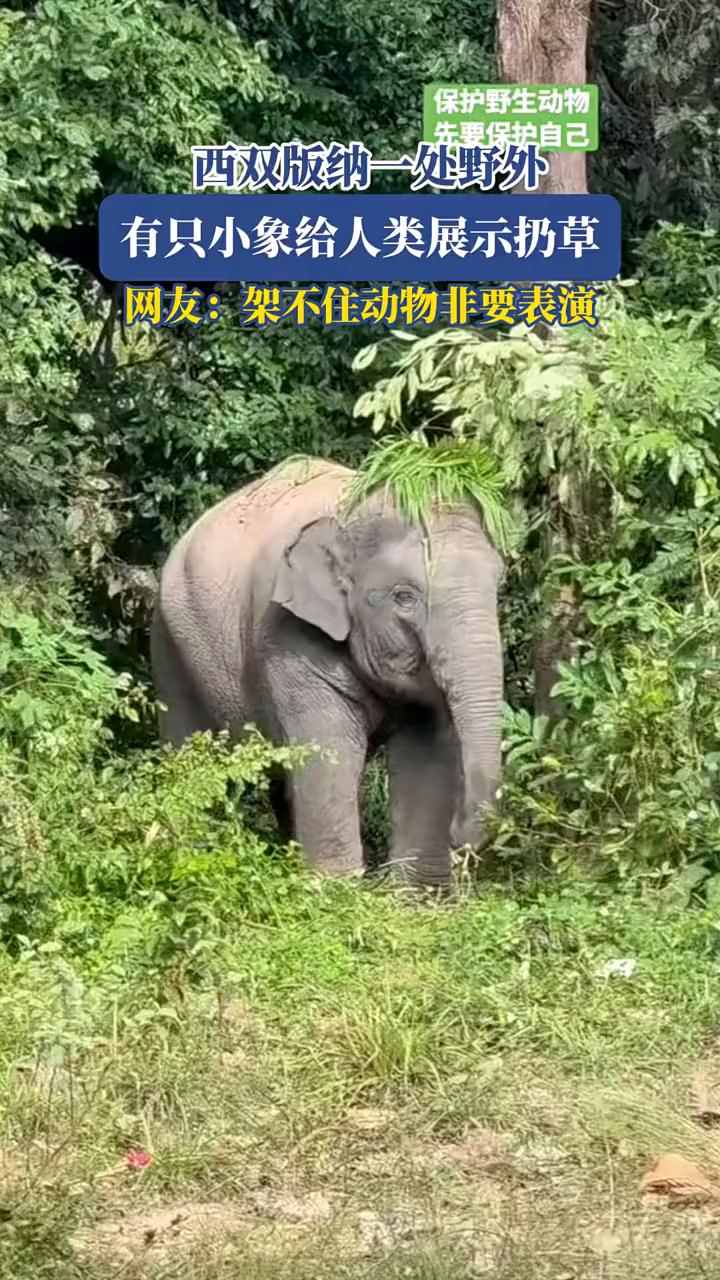 保护野生动物先要保护自己。 西双版纳一处野外有只小象给人类展示扔草。网友:架不住动物非要表演。