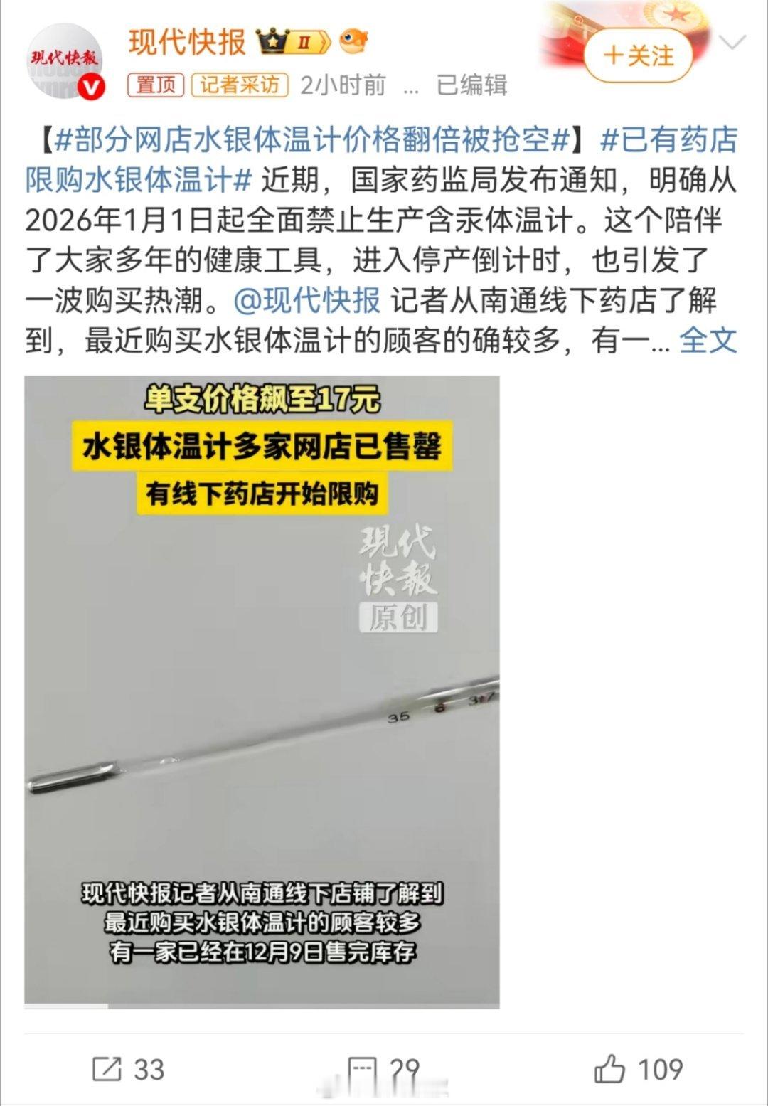 部分网店水银体温计价格翻倍被抢空不至于吧…水银体温计也抢??而且还抢空了,还有就是翻倍价格了。还有,这个没必要抢吧,水银体温计正是因为打烂了之后,汞是有强度性才禁产的。还真的得理性一点啊 广州