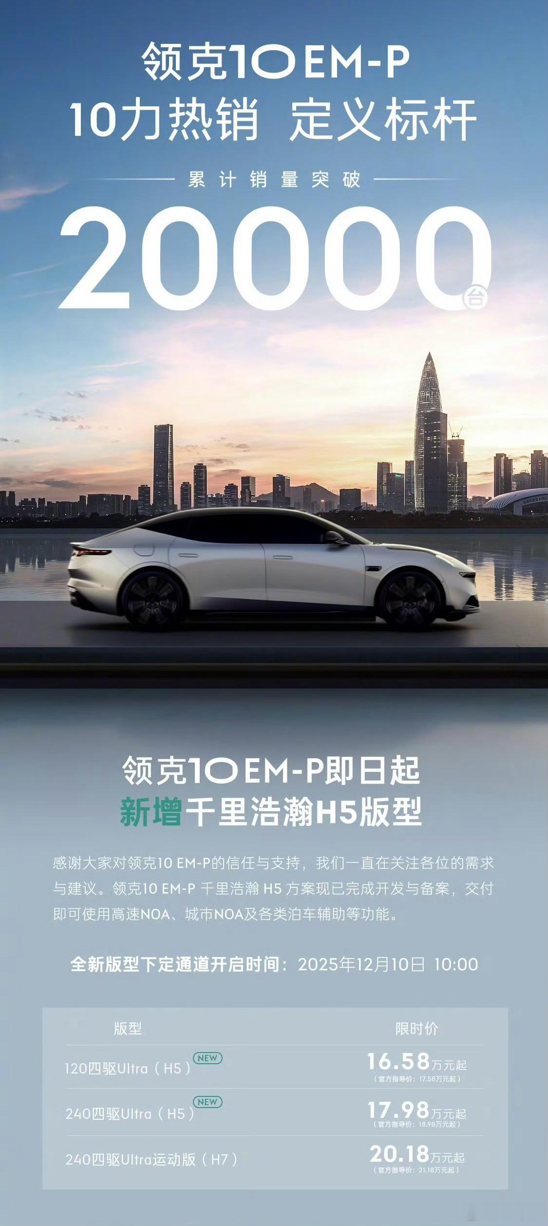 领克10EM-P销量快速突破2万 领克10 EM-P 能三个月卖到 2 万,我觉得最大的杀手锏不是性能、不是智驾、也不是性价比,而是把选配置这件最折磨人的事帮买家搞定了。现在买混动轿车,最痛苦的是选择太多。续航长短?要不要四驱?智驾要不要加钱?越选越贵,越选越焦虑,最后还怕买亏了。领克10 EM-P 把所有关键配置直接做成标配,不给你犯选择困难症机会。四驱标配、智驾硬件标配、激光雷达标配、8295标配。新增 H5 版同样逻辑,把高速 NOA、城市 NOA 直接下放,再把价格往下拉一点。在今年竞争这么激烈的混动市场里,这种简单且确定的产品自然跑得快。领克10em-p销量快速突破2万