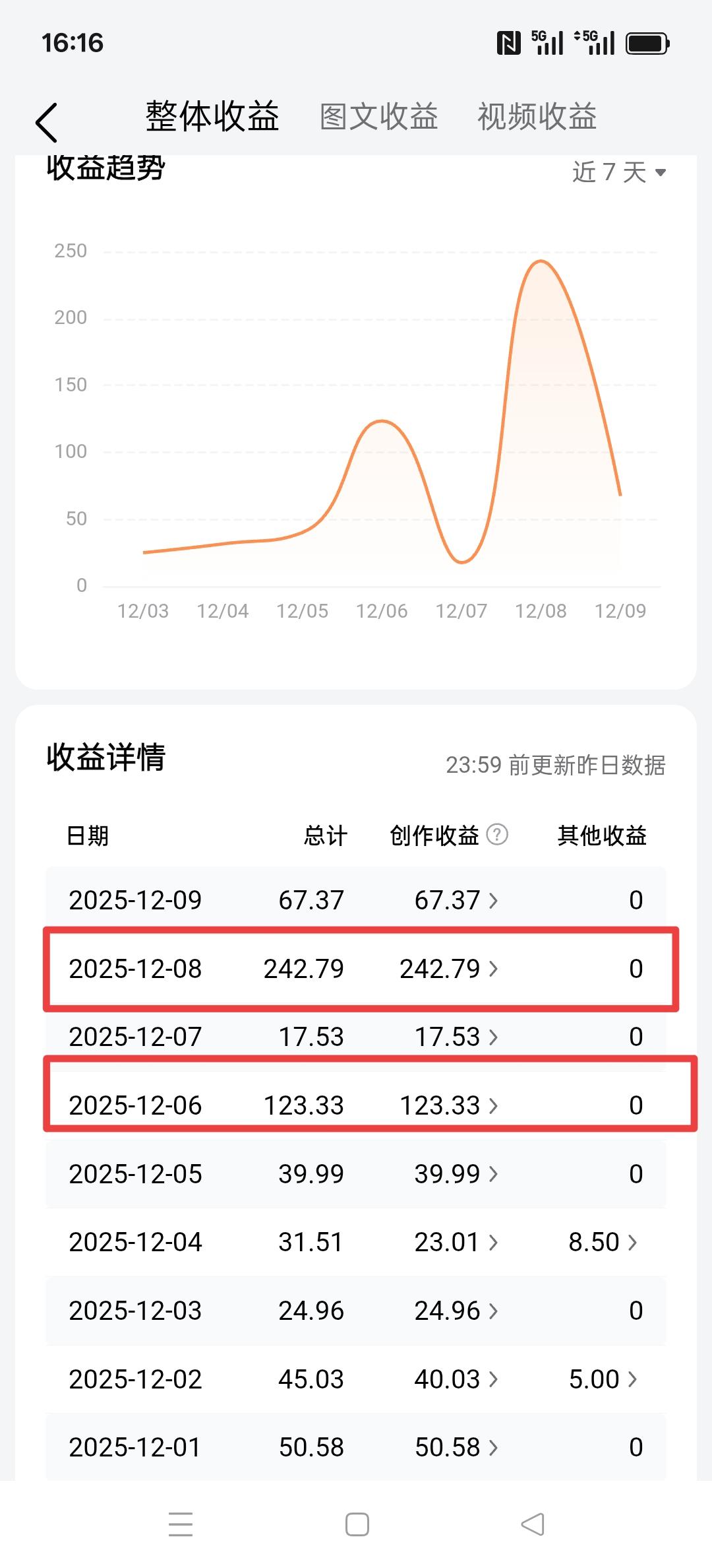 12月已过9天,有2天收益是三位数。这比11月份整体低迷的2位数甚至1位数要好太多了。 不知不觉,2025马上就要结束了。12月份只剩三分之二,做为一名自媒体人这个月要好好冲一冲了。 为什么呢?因为多创造点收入,明年退税时可以获得一笔惊喜。 去年的时候,我退了9000多元的税,尽管相比一些大咖还有好大差距,但是这笔钱还是蛮香的。 不过,今年整体不如去年,奋斗到月底,估摸着明年能退个6-7000吧! 不知各位友友们今年的战绩如何呢?其实,做自媒体无论全职还是兼职,最重要是乐在其中。 如今,平台上有很大一批50-60岁的退休人员,他 / 她们纷纷加入了自媒体行业,而且每天的创作欲望也很强。 这其中也不乏涌现出一批又一批令人佩服的阿姨级大咖,比如素老三等人。 尽管领着退休工资,但她还是每天固定至少8个小时花在头条上。 早上一篇5000字以上的长篇小说,下午3-5篇左右的微头条。 由于她的粉丝粘性度高,无论是文章还是微头条,她的单价贼高。 每天收入基本稳定在400元以上,一个月的收入远超她的退休金。 也难怪她儿子儿媳妇都舍不得让她带孩子。 所以,对于我们这30岁出头的人来说,还有什么理由不努力?