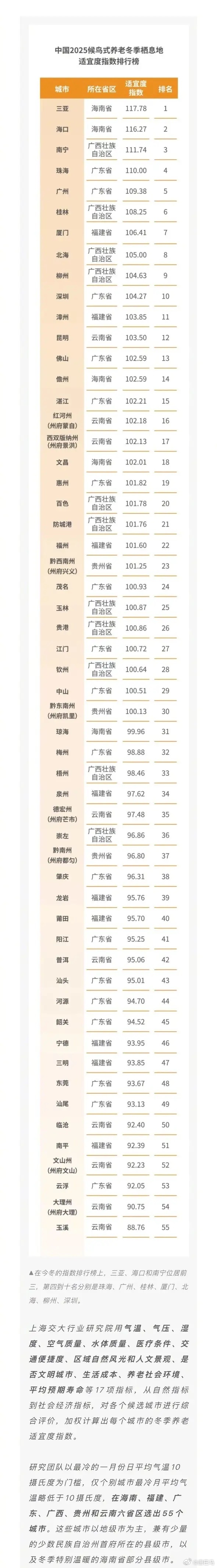 近日,上海交通大学行业研究院发布《2025中国候鸟式养老冬季栖息地适宜度指数》。该指数旨在为日渐盛行的候鸟式养老提供一个具有科学依据的栖息地选择手册。广西11个城市上榜。南宁、桂林、北海、柳州进入TOP10,百色、防城港、玉林、贵港、钦州、梧州、崇左进入前50。