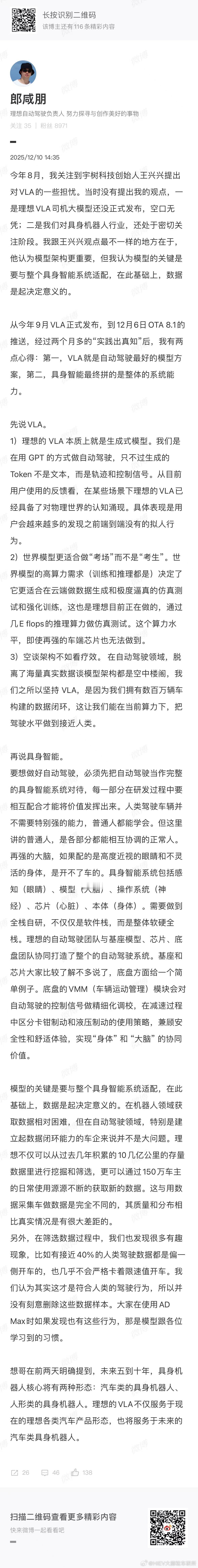 理想智驾VP郎博回应了8月WRC上,宇树王兴兴对VLA的观点:基本上,王兴兴的观点是VLA太依赖高质量数据,所以比较难达到关键突破的临界点,因此,他更倾向于世界模型和视频生成模型。郎回应:「我跟王兴兴观点最不一样的地方在于,他认为模型架构更重要,但我认为模型的关键是要与整个具身智能系统适配,在此基础上,数据是起决定意义的。」基于今年在VLA上的实践,理想认为:第一,VLA就是自动驾驶最好的模型方案;第二,具身智能最终拼的是整体的系统能力。理想VLA已经具备了对物理世界的认知涌现,用户正在越来越多地发现之前端到端没有的拟人行为。世界模型更适合做(云端的)“考场”而不是(车端的)“考生”。郎认为,这主要算力水平决定的,理想正在用几E flops级的推理算力做仿真测试。具身智能领域,理想的VLA不仅会用在汽车上,未来也会用在汽车类的具身机器人上。新能源汽车 $理想汽车 LI$ $理想汽车-W hk02015$理想高管回应王兴兴质疑