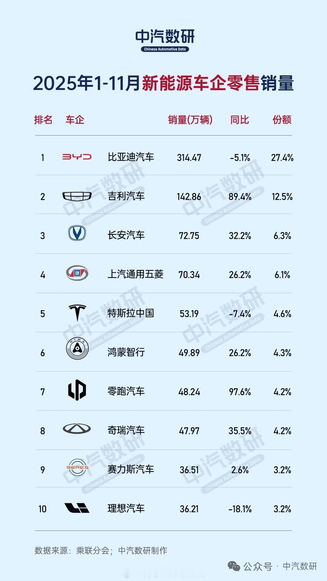 乘联会数据,11月以及1-11月新能源车企零售数据。供大家参考。汽场全开