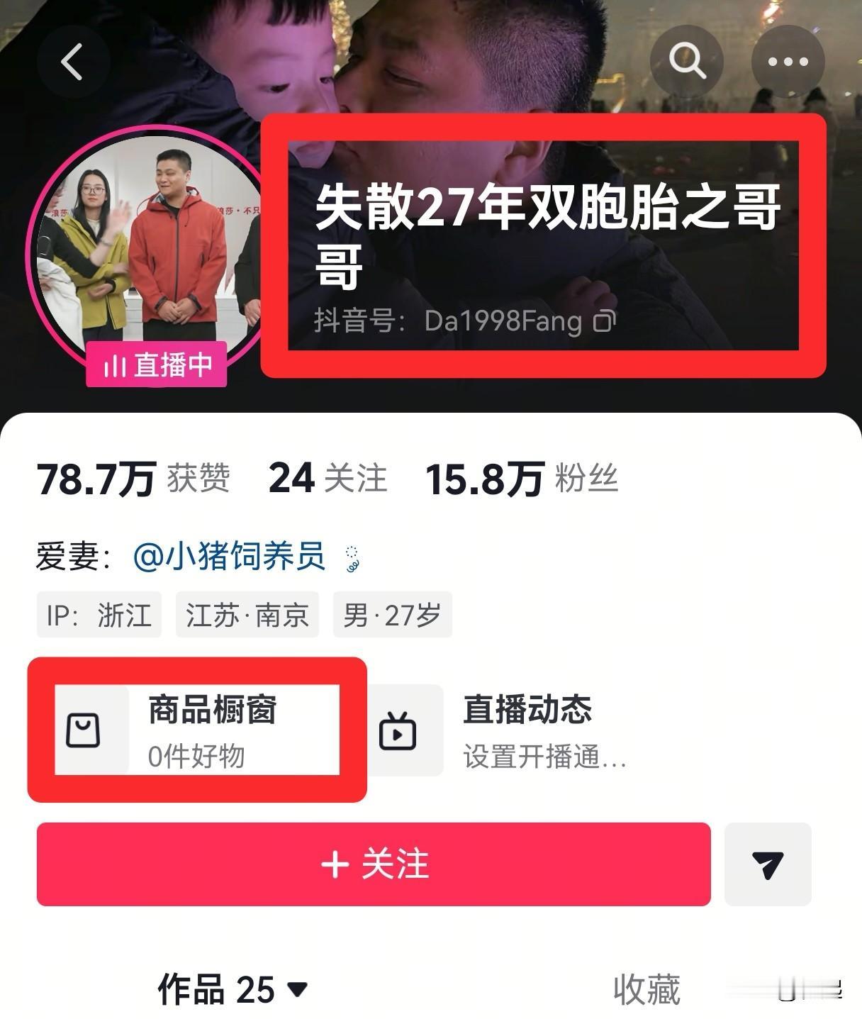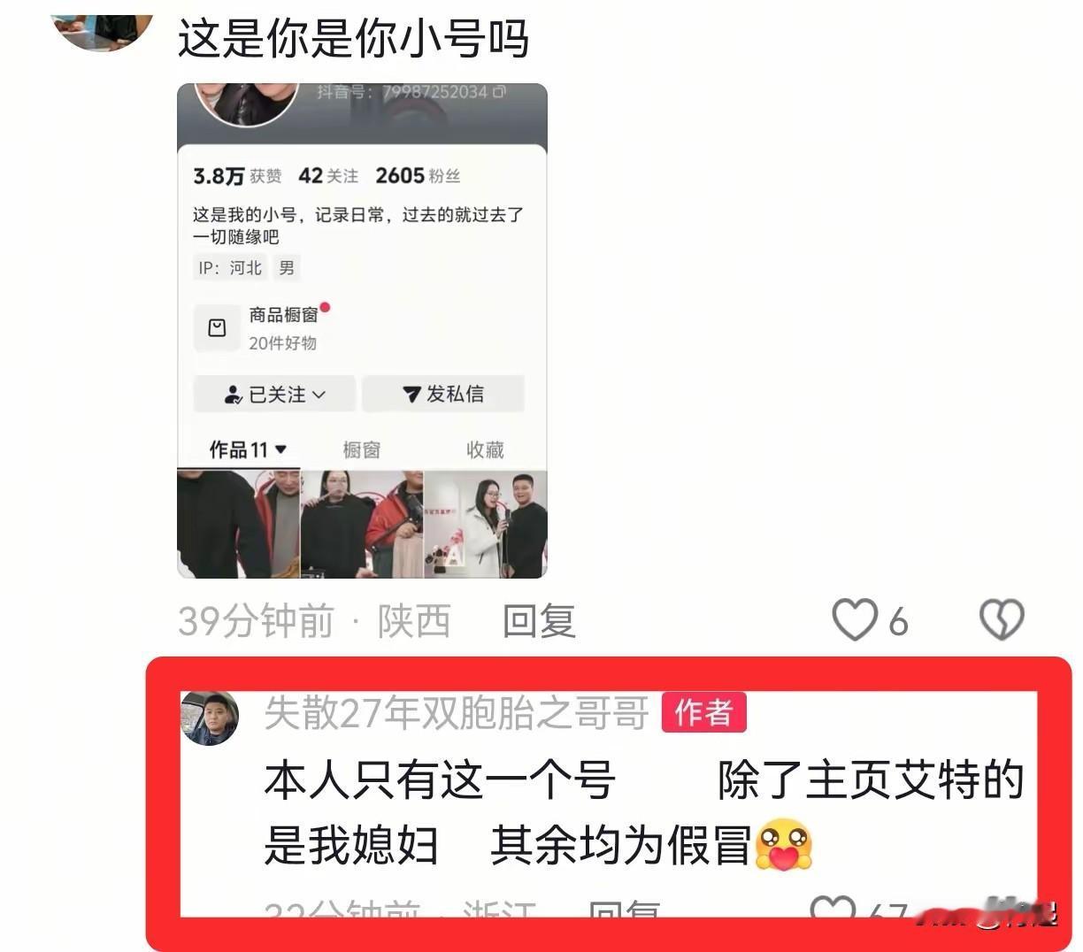 万万没想到, 比双胞胎弟弟更恶心的人出现了! 双胞胎哥哥现在也是人红是非多,今天首次直播带货刚取得开门红,这边就出现了另外一个“双胞胎哥哥”,连简介都是哥哥说过的话。 要知道双胎哥哥自己的这个账号,橱窗根本就没有开,而这个冒充的号已经有2600多个粉丝,还开通了橱窗,很多不明所以的粉丝,已经下单支持了。 朱进紧急辟谣,他只有一个账号,除了主页@那个是他老婆的,其他都是假冒的,大家千万不要上当。