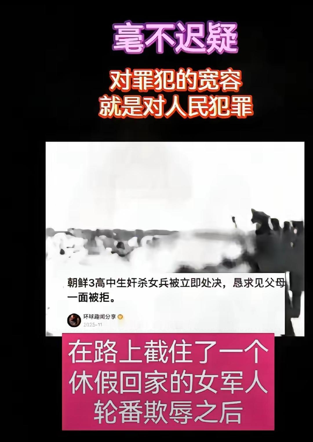 朝鲜这事, 三个高中生性侵杀害休假女兵,直接枪决了。 他们未成年,但朝鲜没手软。 案子细节让人发凉,女兵坐车回家,车坏了走路,被盯上。事后三人还想坐同一辆车跑,司机觉得行李眼熟,直接开进警察局。 朝鲜军人地位高,动军人就是动国家神经。 那边青少年犯罪最近不少,听说之前还有学生性侵女老师,老师自杀了。当局搞了整顿小组,要严打。 这事和韩国不一样。韩国《少年法庭》那剧,讲的是少年法重教轻罚。朝鲜反过来,看罪行轻重超过年龄大小。 法律不一样,背后是对人能不能改的看法不同。有的地方觉得能教好,朝鲜这次觉得,有些恶,不能等。性侵案