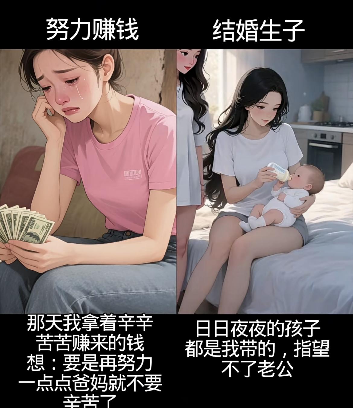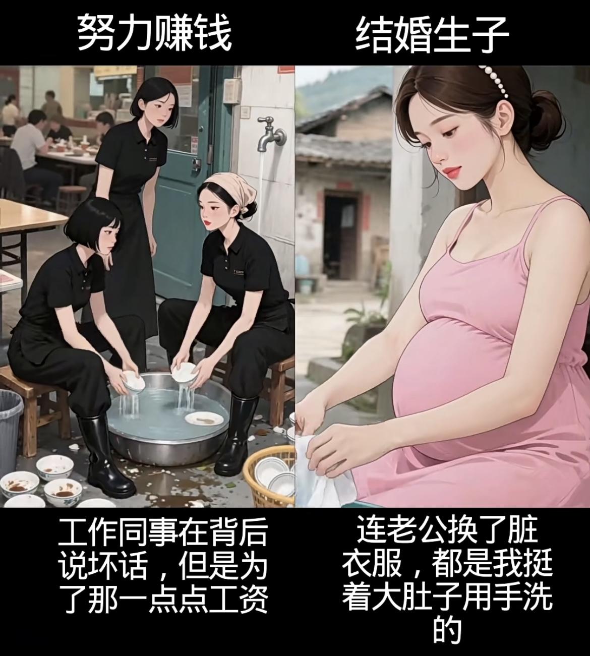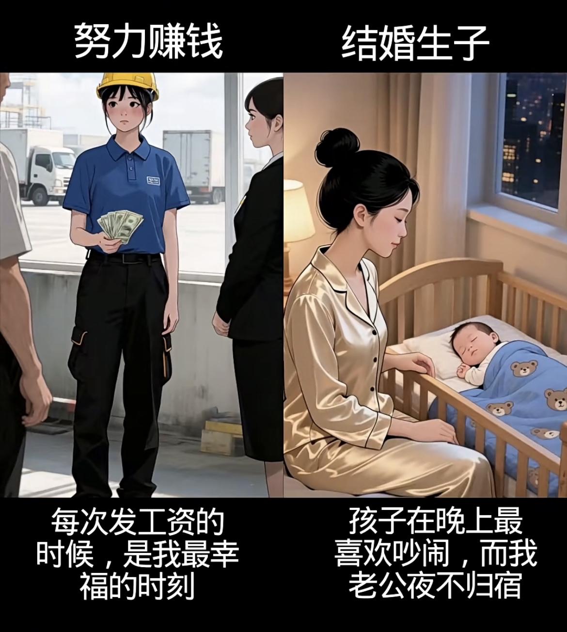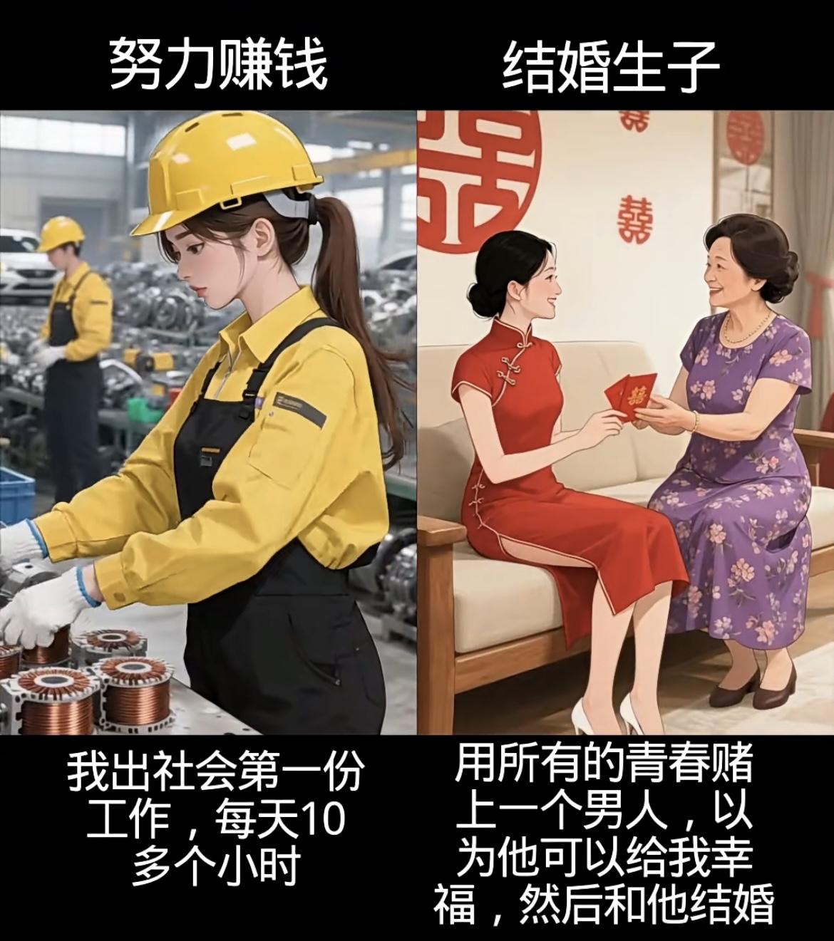 左边努力赚钱线: • 从工厂10小时工、送餐被刁难、洗碗受闲话,到扛工地活,每一分钱都浸着辛苦,却攥着让爸妈轻松的盼头; • 遇贵人、凭能力进公司,4年熬成高级职,8000工资是熬夜拼来的底气,钱和底气都握在自己手里。 右边结婚生子线: • 赌上青春嫁的人,孕期是自己做饭洗衣,生子时他缺席,带娃夜闹时他夜不归宿; • 一日三餐围着他转,镜中自己越来越不自信,只剩胡思“怎么把日子过好”的迷茫。 你想成为什么样的人生呢……[震惊][吃瓜群众]