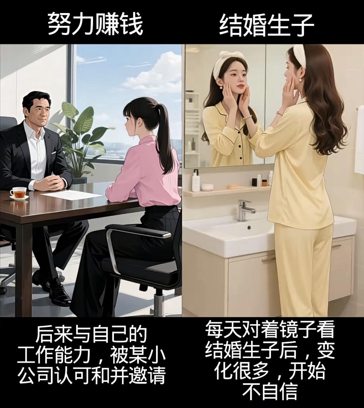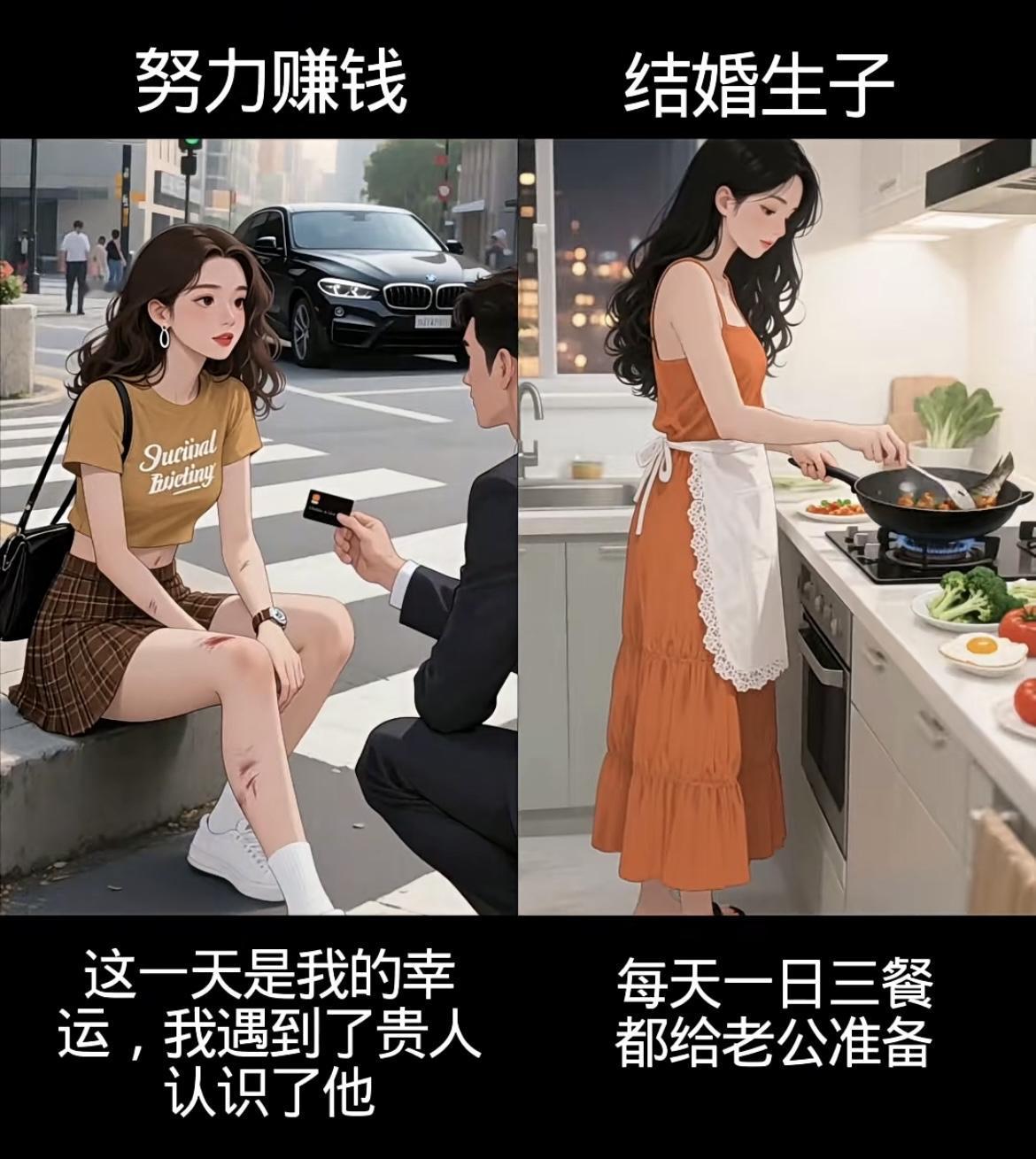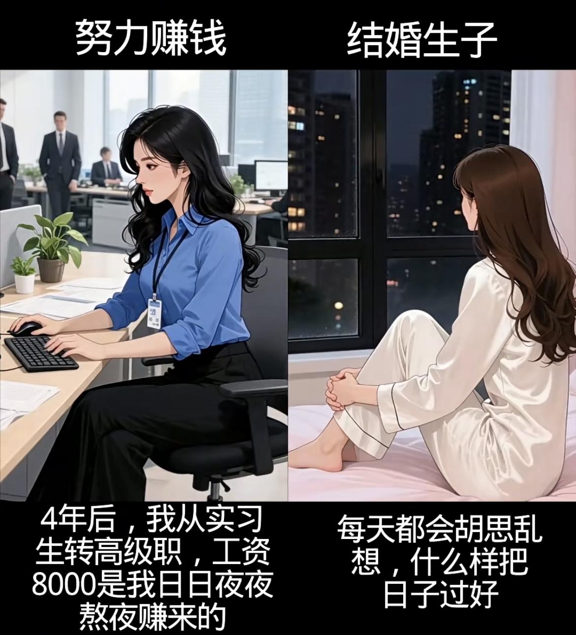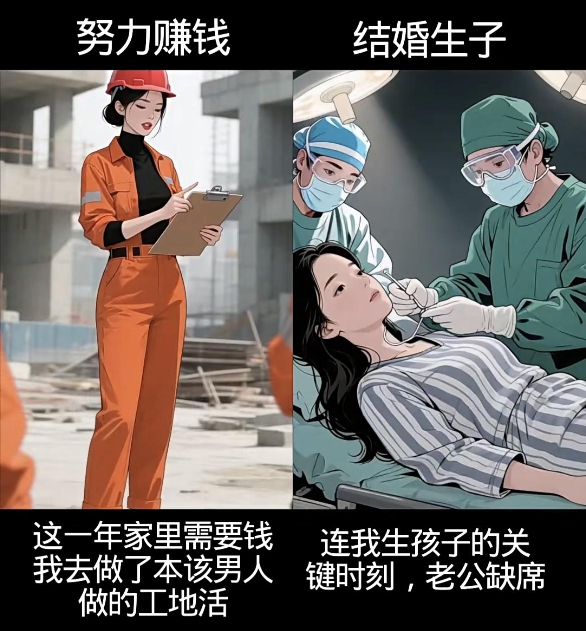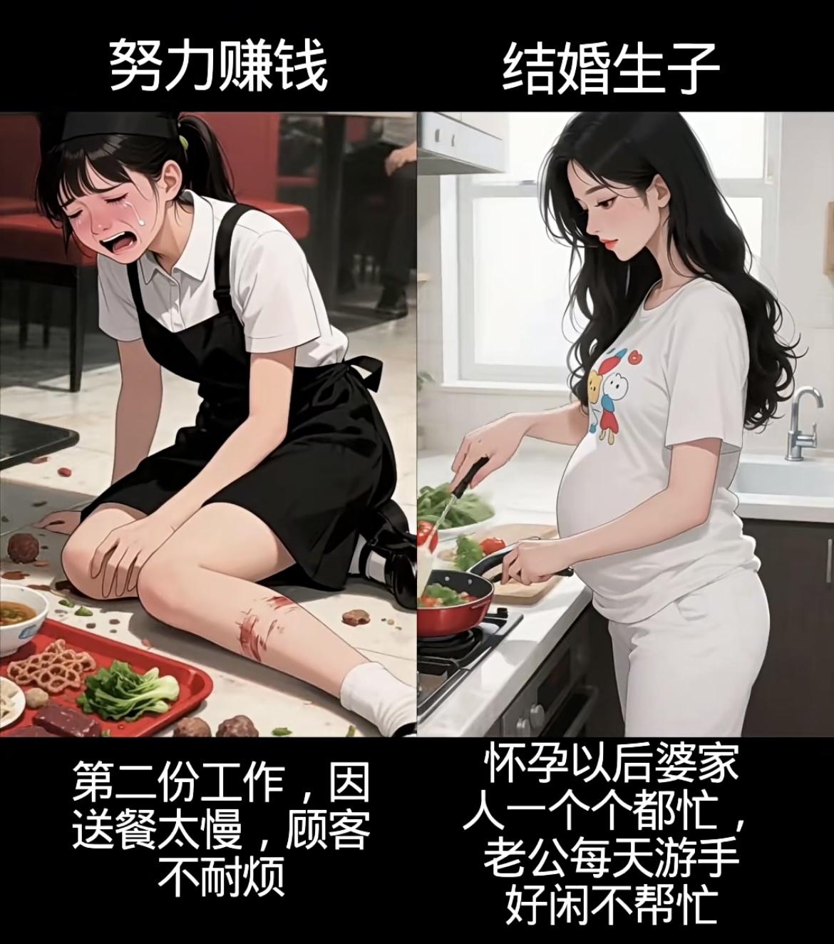 左边努力赚钱线: • 从工厂10小时工、送餐被刁难、洗碗受闲话,到扛工地活,每一分钱都浸着辛苦,却攥着让爸妈轻松的盼头; • 遇贵人、凭能力进公司,4年熬成高级职,8000工资是熬夜拼来的底气,钱和底气都握在自己手里。 右边结婚生子线: • 赌上青春嫁的人,孕期是自己做饭洗衣,生子时他缺席,带娃夜闹时他夜不归宿; • 一日三餐围着他转,镜中自己越来越不自信,只剩胡思“怎么把日子过好”的迷茫。 你想成为什么样的人生呢……[震惊][吃瓜群众]
