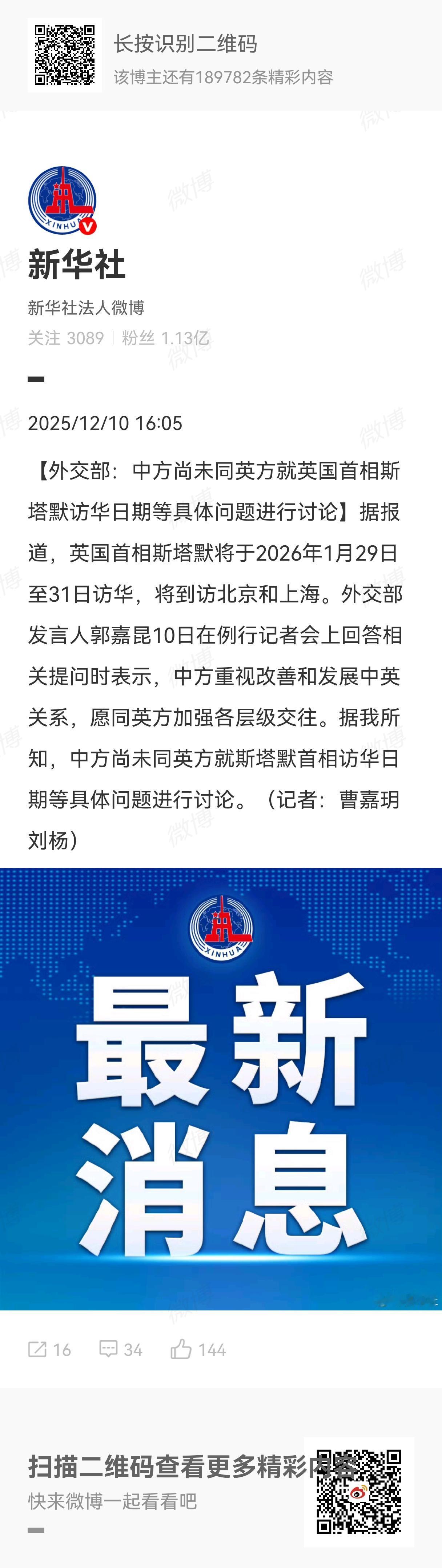 英国首相斯塔默宣布将于2026年1月29日至31日访华,将到访北京和上海。郭嘉坤记者招待会回应:中方尚未同英方就英国首相斯塔默访华日期等具体问题进行讨论。意思是双方是说了斯塔默可以访华,具体好久访问,看你表现。英国人还停留在日不落帝国美梦中,所以喜欢当祖师爷,要多吹吹风美梦才会醒。