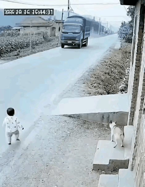 惊呆了,惊险的时刻,狗将小孩救了! 监控视频拍到,一个一岁多的小女孩,自己一人走出马路,对面来了一辆大货车,就快离小孩不远时,这个狗赶紧从家里跑出来,咬住小孩的衣服,救了小孩一命,小孩被狗吓得哇哇大哭, 这个狗太懂人性了,知道小孩在外面有危险,赶紧从家里跑出来救小孩👶🏻家里养到这么好的狗,还能帮忙看小孩,真的太好了。狗救人