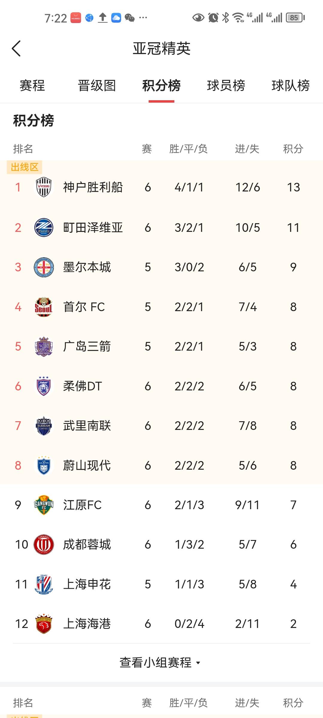 亚冠第6轮,上海申花0:1广岛三箭,陈威成海港遮羞布,成都蓉城2:2平榜首成中超球队遮羞布,上海双熊携手出局。 亚冠联赛第6轮 上海海港0:0柔佛, 中超3连冠,亚冠3连败。昨天第6轮,海港客场挑战马来赵柔佛,依靠门将陈威的10次关键扑救,才拿到1场平局,6轮过后,4负2平,进2球丢11球,积2分,东亚区小组垫底,提前淘汰。倘若不是陈威的超常发挥,至少0:3。这就是备受球迷诟病的窝里横,名副其实呵。柔佛新山48次射门20次射正,海港仅4次射门2次射正。 成都蓉城客场2:2神户胜利船 成都蓉城成为中超球队的遮羞布。成都蓉城面对小组榜首,没有退缩,斗志昂扬,二度领先,运气差一点,二次射门击中门柱,否则就是一场胜利。特别是韦世豪,敢于拿球,敢于突破,造了一粒点球。比赛中在形势不利的情况下,硬刚小日子,为球队赢得喘息时间。结束时,甚至日本球迷也为成都蓉城鼓掌,赢得了对手的尊重。 上海申花客场0:1广岛三箭, 上海申花一直被广岛三箭围攻,屈指可数的机会又把握不住。第78分钟,三箭利用角球机会,荒木隼人头球破门,1:0。全场比赛结束, 6轮战罢,上海海港积2分,早早出局,上海申花积4分,成都蓉城成绩最好积6分,余下2场只要赢一场就可以进入淘汰赛。